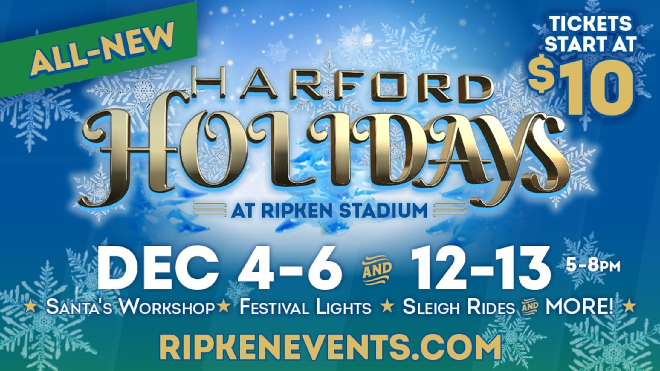 UPDATE: We are so excited for our Harford Holidays event to get started soon, and appreciative of the excitement surrounding the event! Unfortunately, due to shipping delays on some of the wonderful items that will decorate the ballpark, the first weekend of the event will not be able to happen.