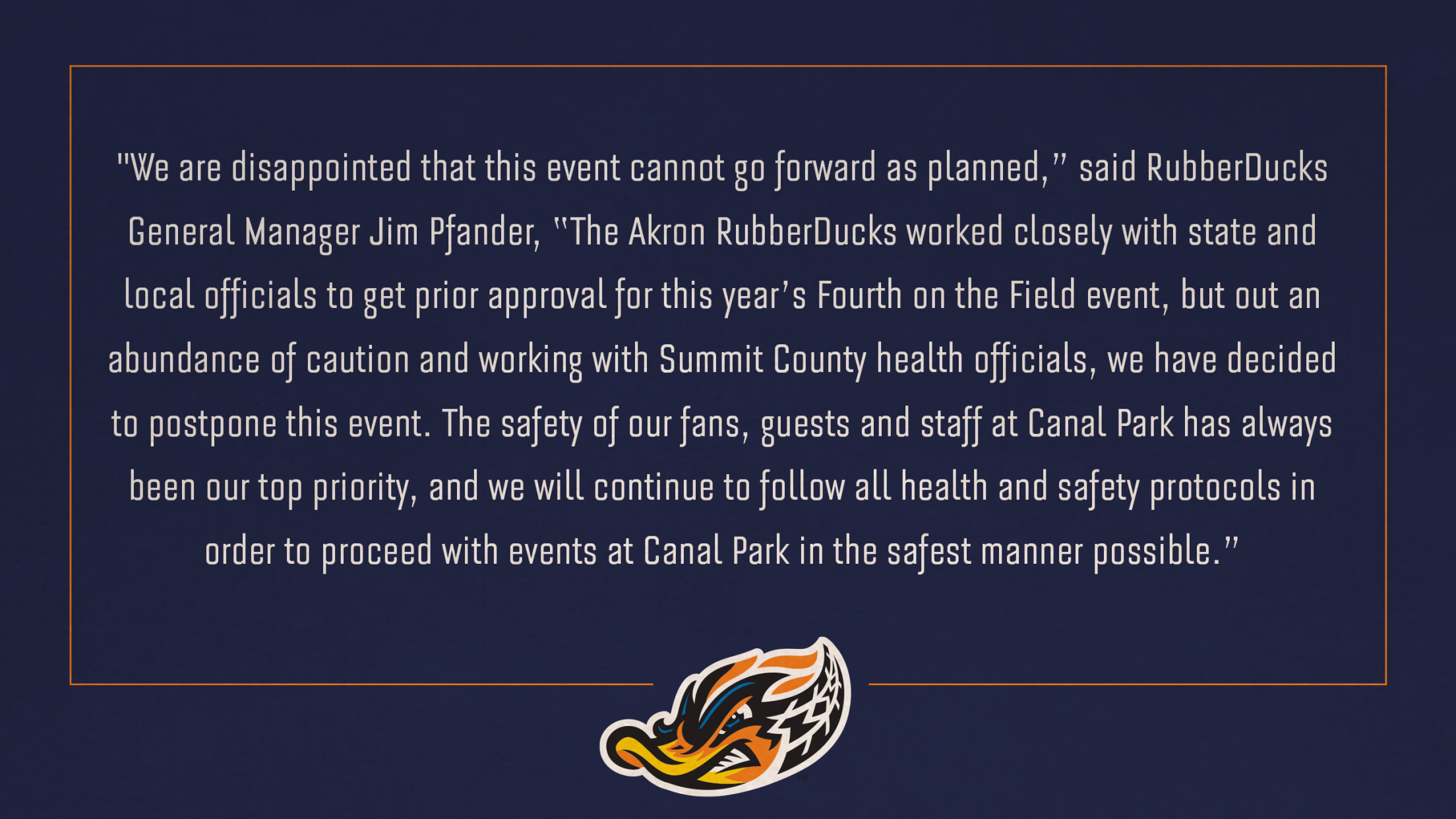 "We are disappointed that this event cannot go forward as planned,” said RubberDucks General Manager Jim Pfander, “The Akron RubberDucks worked closely with state and local officials to get prior approval for this year’s Fourth on the Field event, but out an abundance of caution and working with Summit County health officials as it pertains to fireworks gatherings, we have decided to postpone this event. The safety of our fans, guests and staff at Canal Park has always been our top priority, and we will continue to follow all health and safety protocols in order to proceed with events at Canal Park in the safest manner possible.”