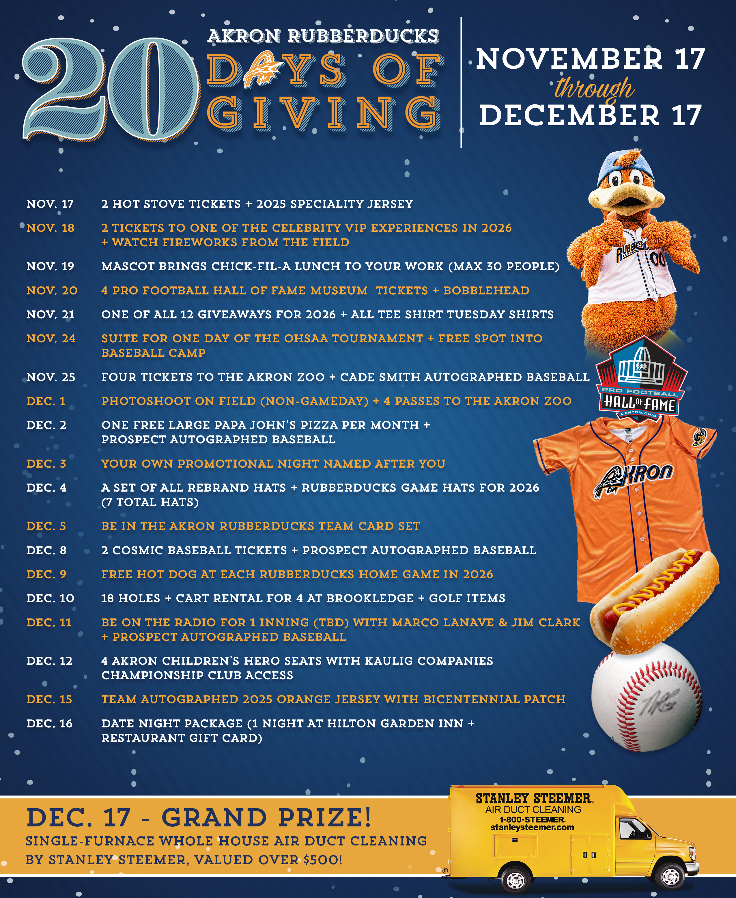FULL PRIZE LIST (AKRON, OHIO) November 12, 2025 – The Akron RubberDucks announce the return of the annual 20 Days of Giving starting Monday, Nov. 17, 2025. The 20 Days of Giving are packed with unique, experience-based prizes only available during this once-a-year promotion. Some of this year’s top prizes