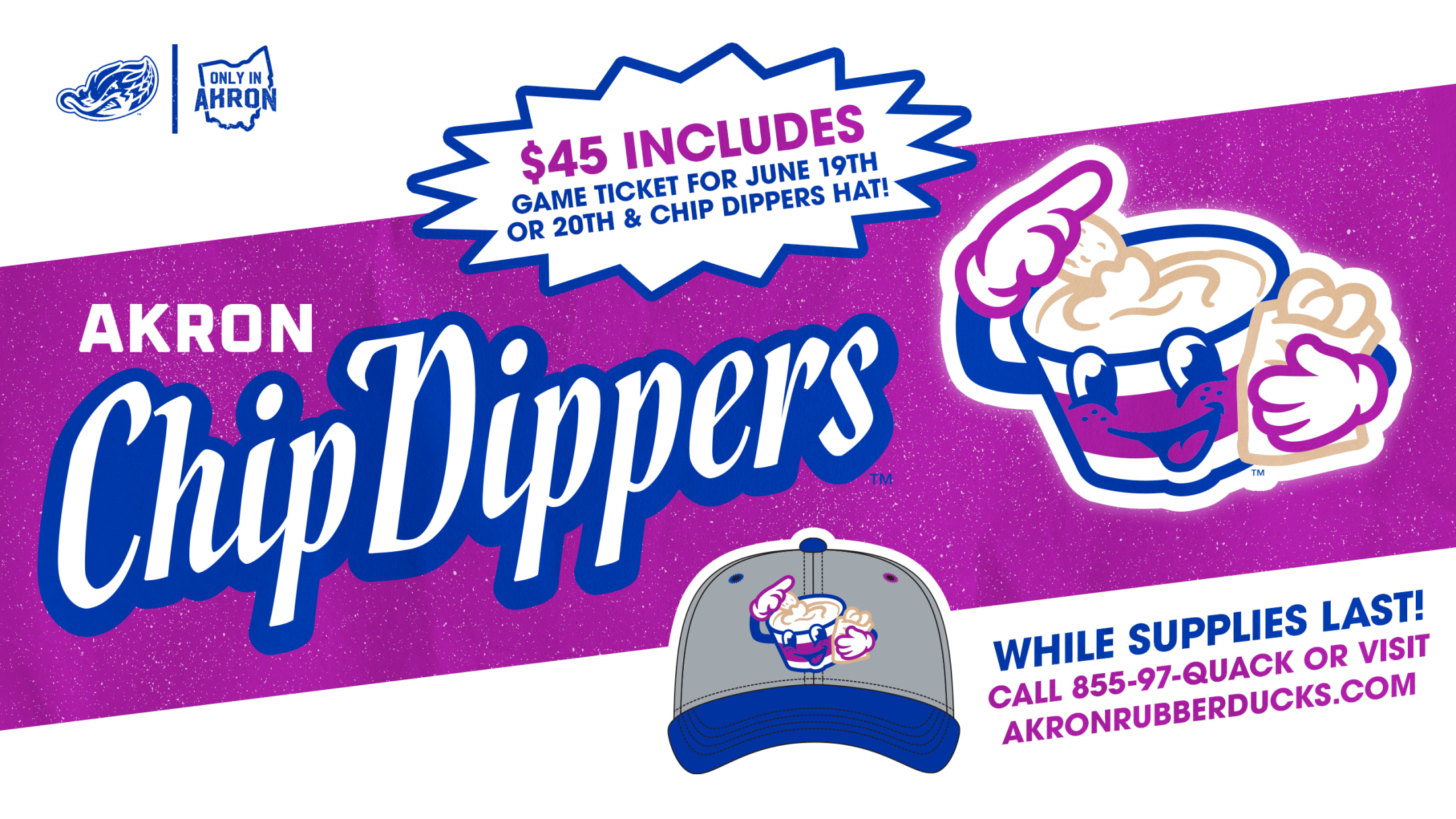 You can purchase the “Chip Dippers” ticket package today and receive a ticket to the June 19 or June 20 game and an Akron Chip Dippers adjustable hat. The package is $45 and can be purchased here. Limited number of packages available.