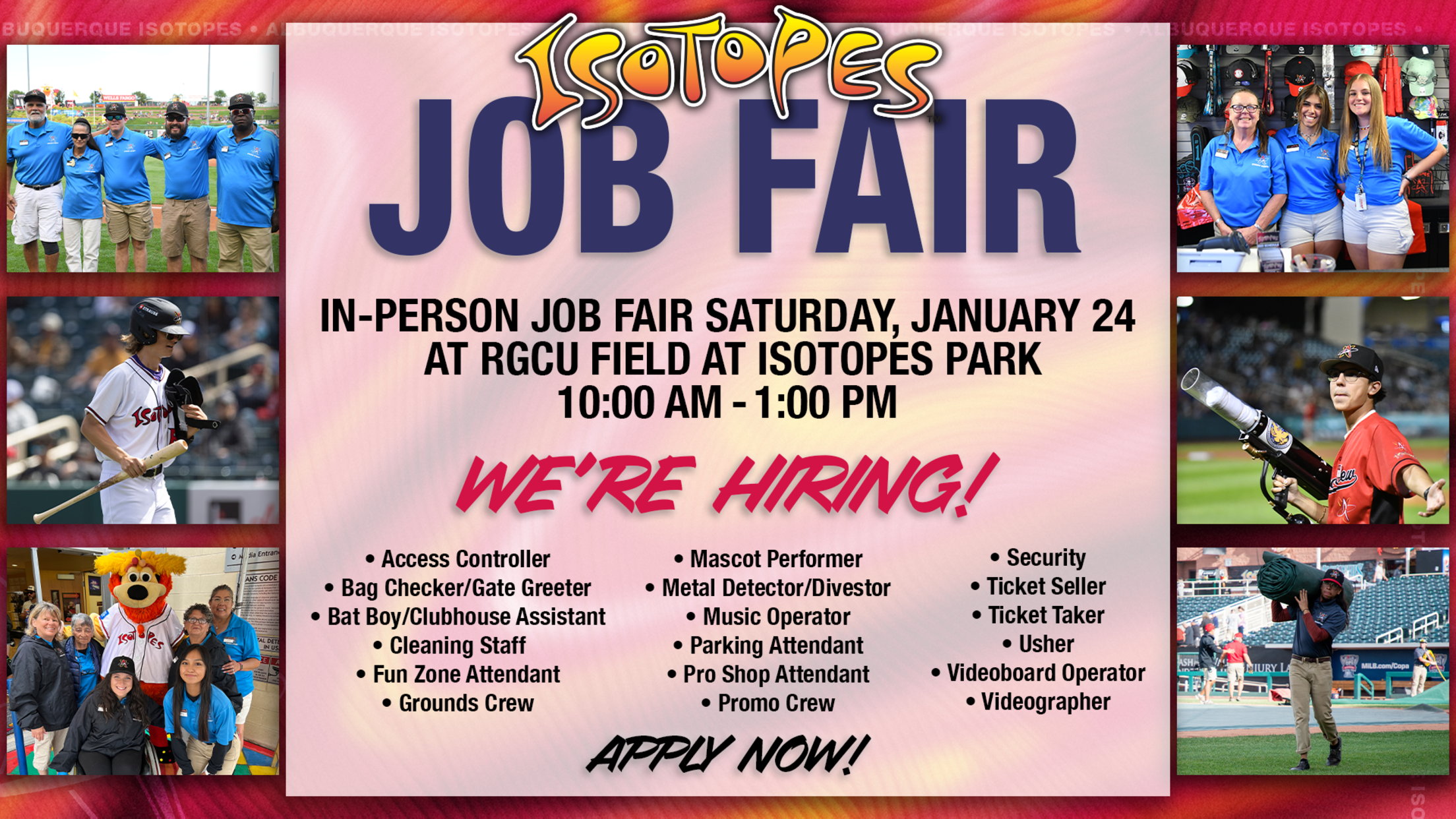 The Albuquerque Isotopes are hosting an in-person Job Fair on Saturday, January 24 from 10:00 am until 1:00 pm at Rio Grande Credit Union Field at Isotopes Park. The organization, along with stadium concessionaire Oak View Group (OVG) Hospitality, is looking to fill dozens of seasonal part-time positions needed to
