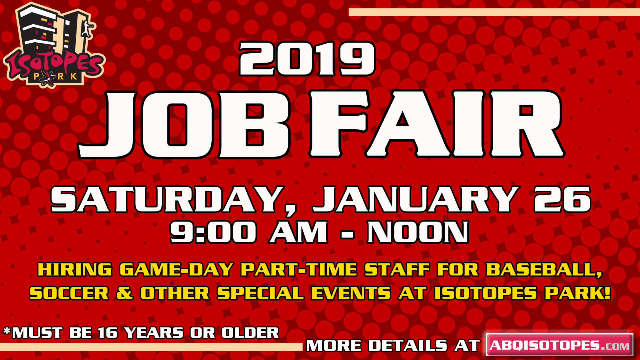 The Albuquerque Isotopes and Spectra Food Services and Hospitality will be holding their 17th annual Job Fair on Saturday, January 26, from 9 a.m. to noon at Isotopes Park. The Isotopes Job Fair has attracted hundreds of people looking for game-day and seasonal employment at Isotopes Park. The Isotopes are