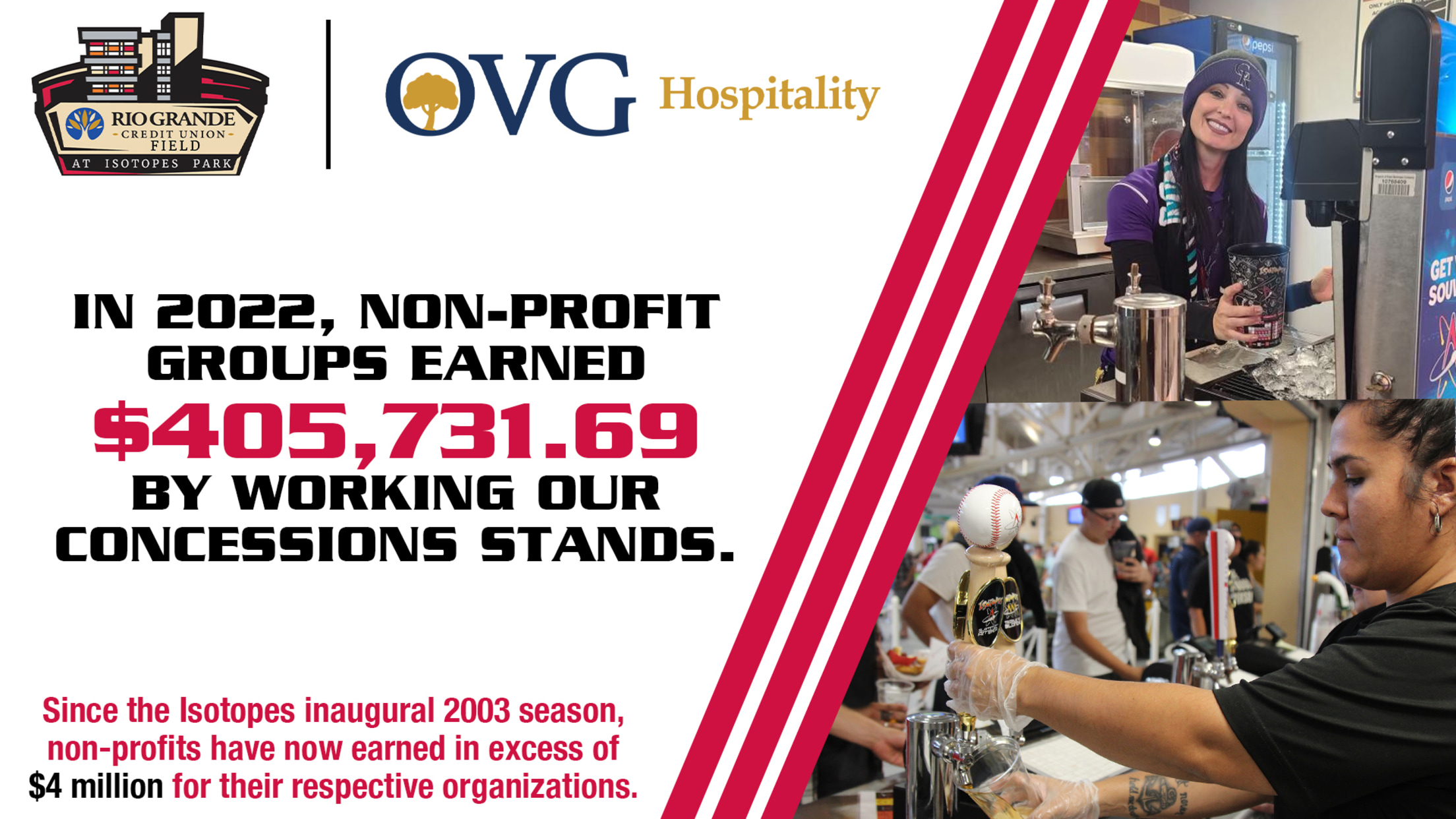 The Albuquerque Isotopes today announced that the 10 non-profit groups working concessions at Isotopes Park cumulatively raised 405,731 during the 2022 season. Since the facility opened in 2003, stadium concessionaire Oak View Group has employed non-profit groups to operate many of the concessions stands at the ballpark, helping raise funds