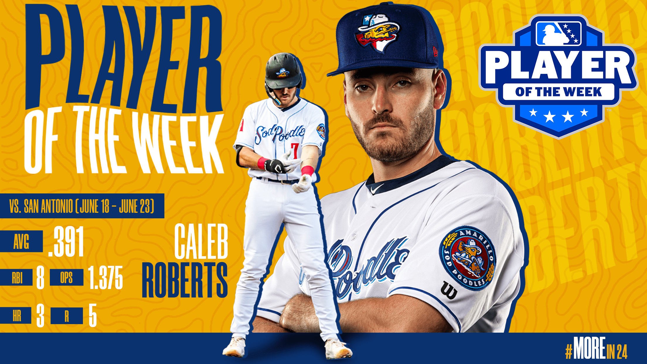 Amarillo, Texas (June 24, 2024) – Today, Minor League Baseball announced Players and Pitchers of the Week for June 18-23 for all 14 leagues in Minor League Baseball. Amarillo C/DH Caleb Roberts was named the Texas League Player of the Week, the sixth weekly award by an Amarillo player in