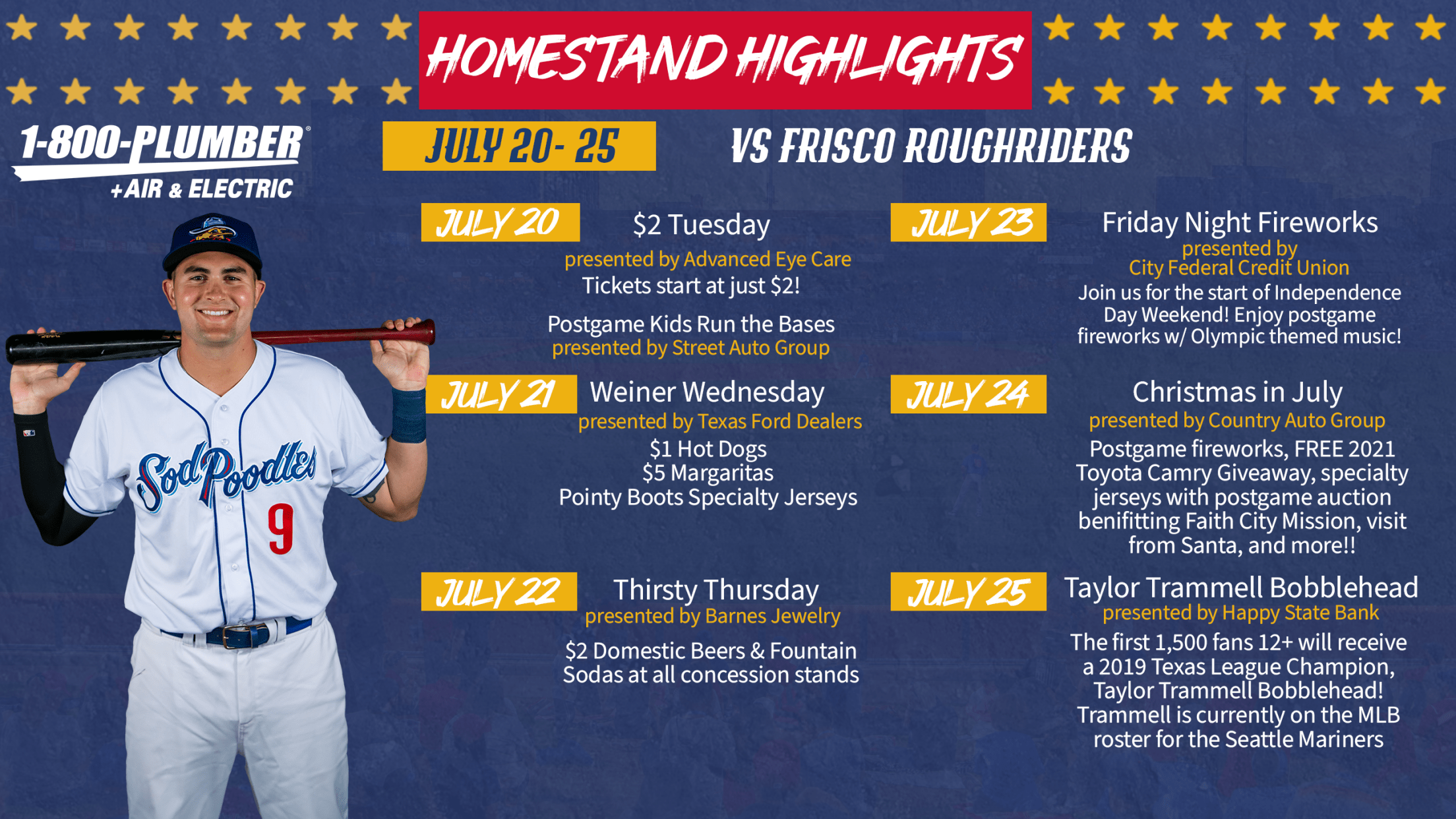 The homestand features all of the weekly affordable, family-friendly promotions as well as two theme nights, four fan giveaways, a FREE CAR, and fireworks!