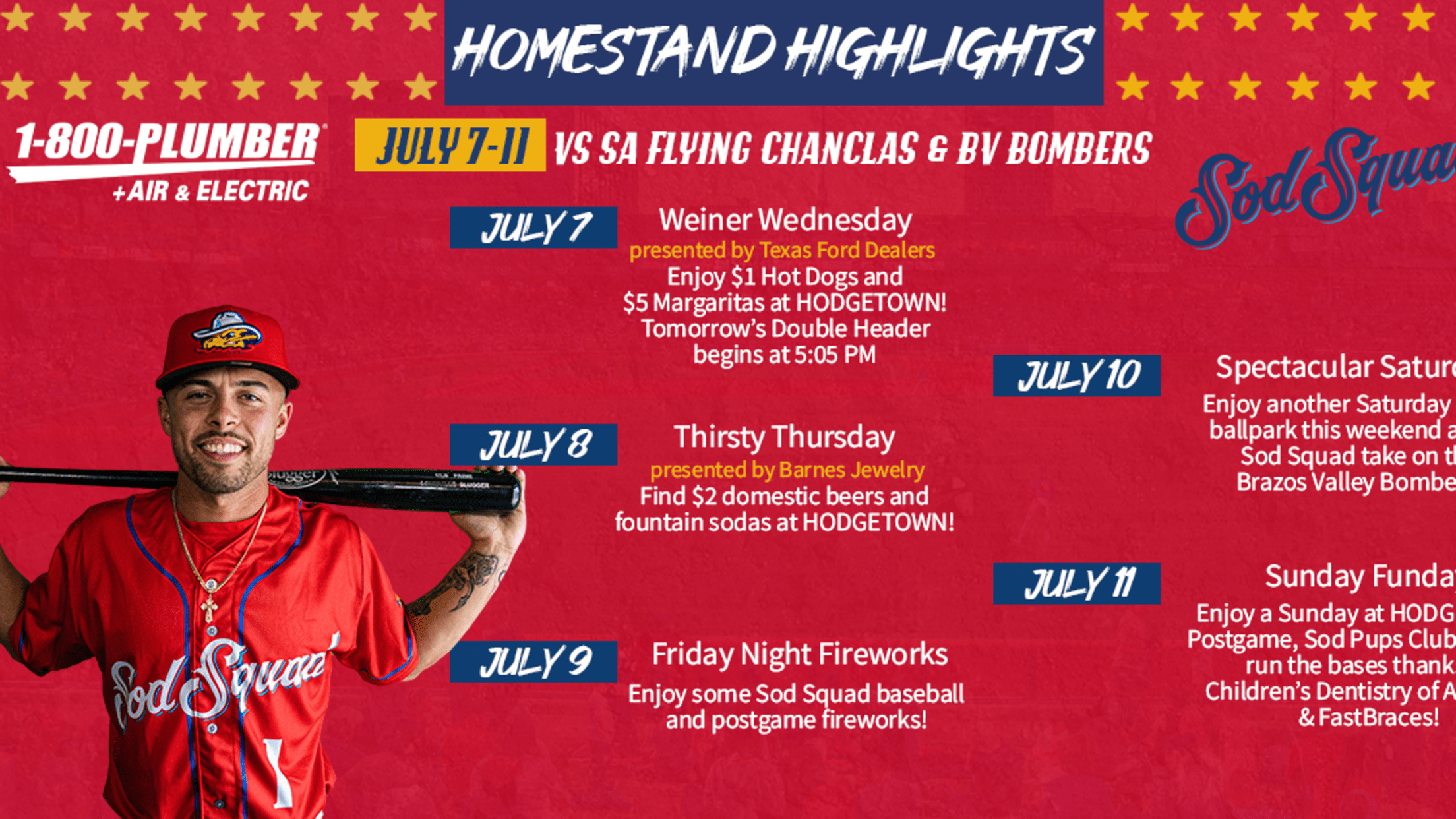 The Amarillo Sod Squad, summer collegiate wood-bat baseball team, will kick off a six-game homestand at HODGETOWN beginning Wednesday, July 7 and running through Sunday, July 11. The Sod Squad will take on the San Antonio Flying Chanclas for three games, starting with a doubleheader tomorrow, followed by the Brazos Valley Bombers Friday through Sunday.
