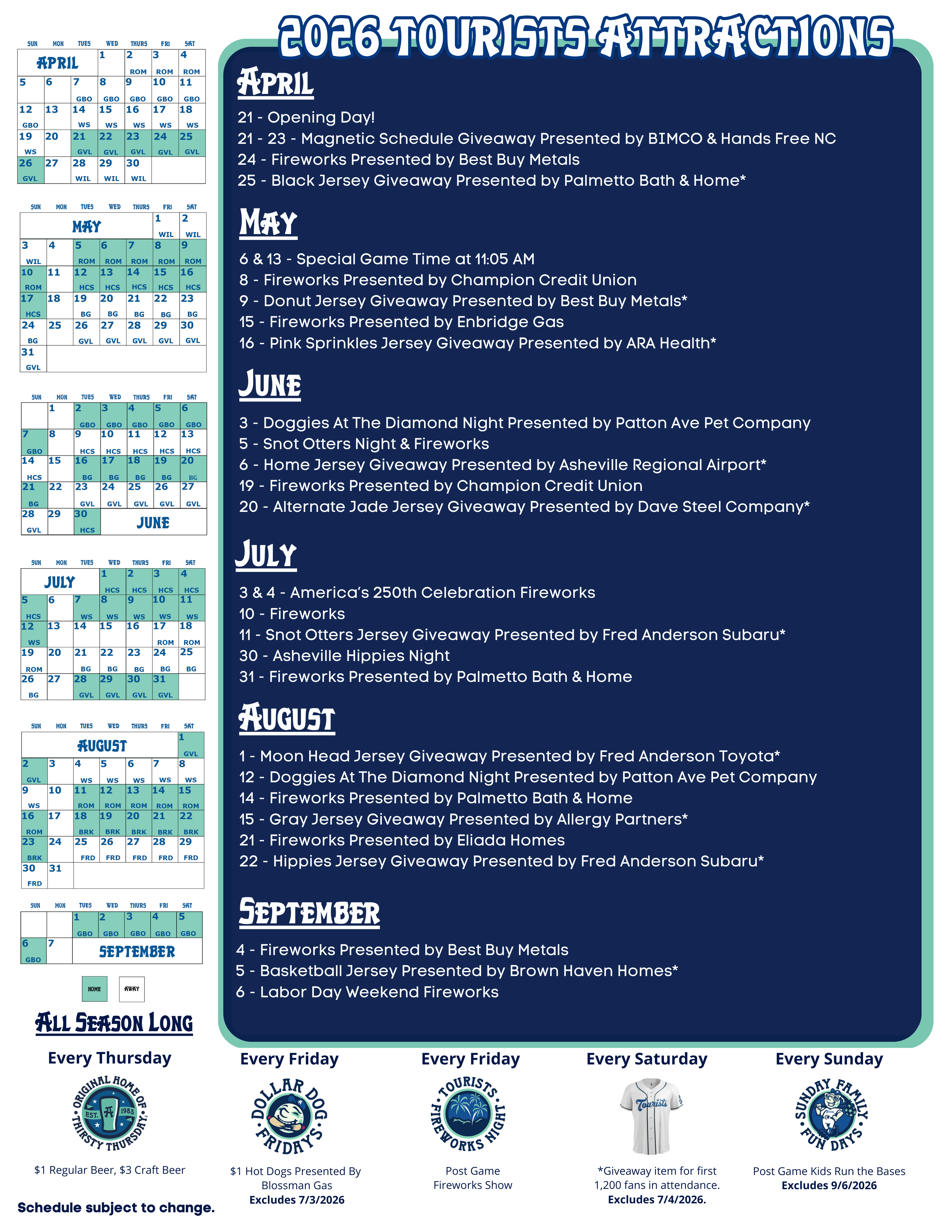 ASHEVILLE, NC - Closing out the home 2025 season, the Asheville Tourists battled one final time at McCormick Field, falling to the Hub City Spartanbugers 4-2. Long balls powered the Tourists' (51-71) offense. Tying the game at one in the second, Drew Vogel launched a ball over the left field