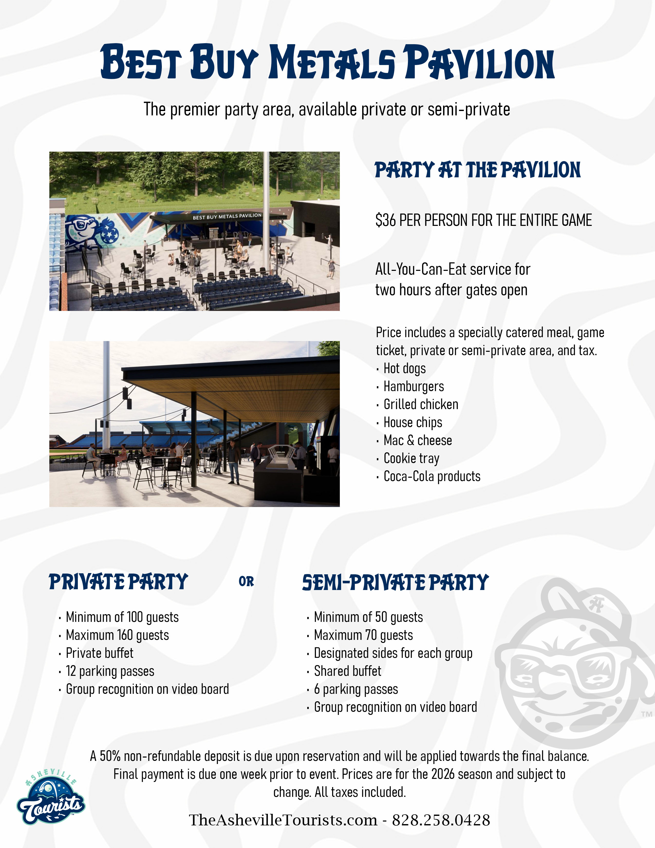 Please note - A 50% non-refundable deposit is due upon reservation and will be applied towards the final balance. Final payment is due one week prior to the event. Prices are for the 2026 season and subject to change. All taxes included.