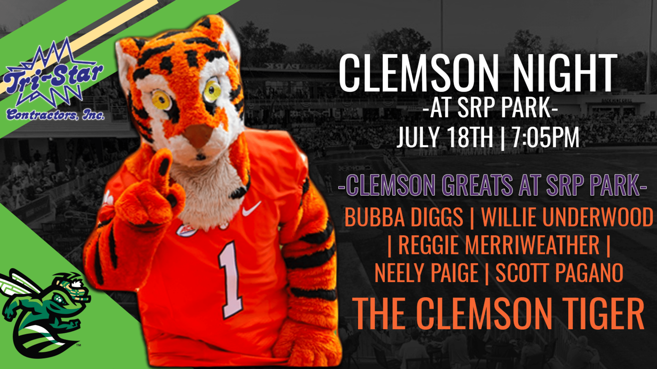 NORTH AUGUSTA, SC - The Augusta GreenJackets, South Atlantic League Affiliate of the San Francisco Giants, in conjunction with Tri-Star Contractors, are excited to welcome the Clemson Tiger and other Clemson greats to SRP Park for Clemson Night on Thursday, July 18th.