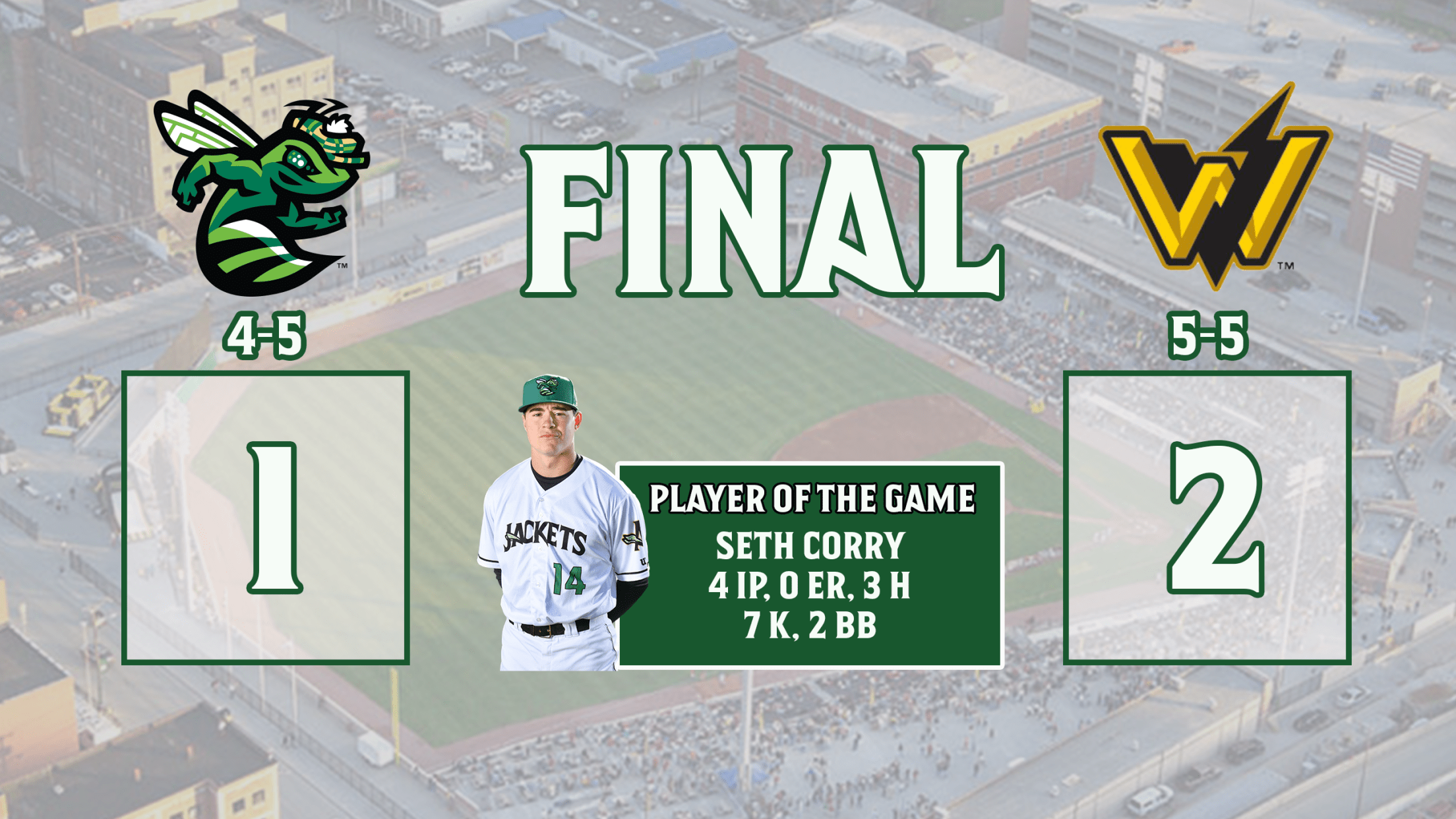 After Corry went four innings for the GreenJackets, Keaton Winn came on in relief. In the 5th inning, with the bases loaded and nobody out, West Virginia's Ryan Ramiz hit into a fielders choice allowing Ryne Ogren to score, plating the games first run.