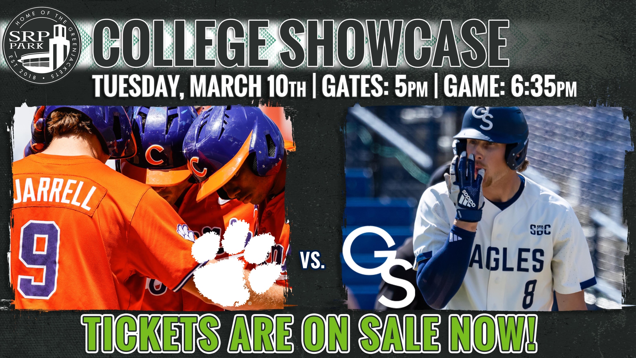 NORTH AUGUSTA, SC: SRP Park, in partnership with Clemson University (Atlantic Coast Conference) and Georgia Southern University (Sun Belt Conference), is excited to usher in a new year of the SRP Park College Baseball Showcase on Tuesday, March 10th. Clemson University will be the home team, with first pitch slated for 6:35PM. Gates will open at 5:00PM.