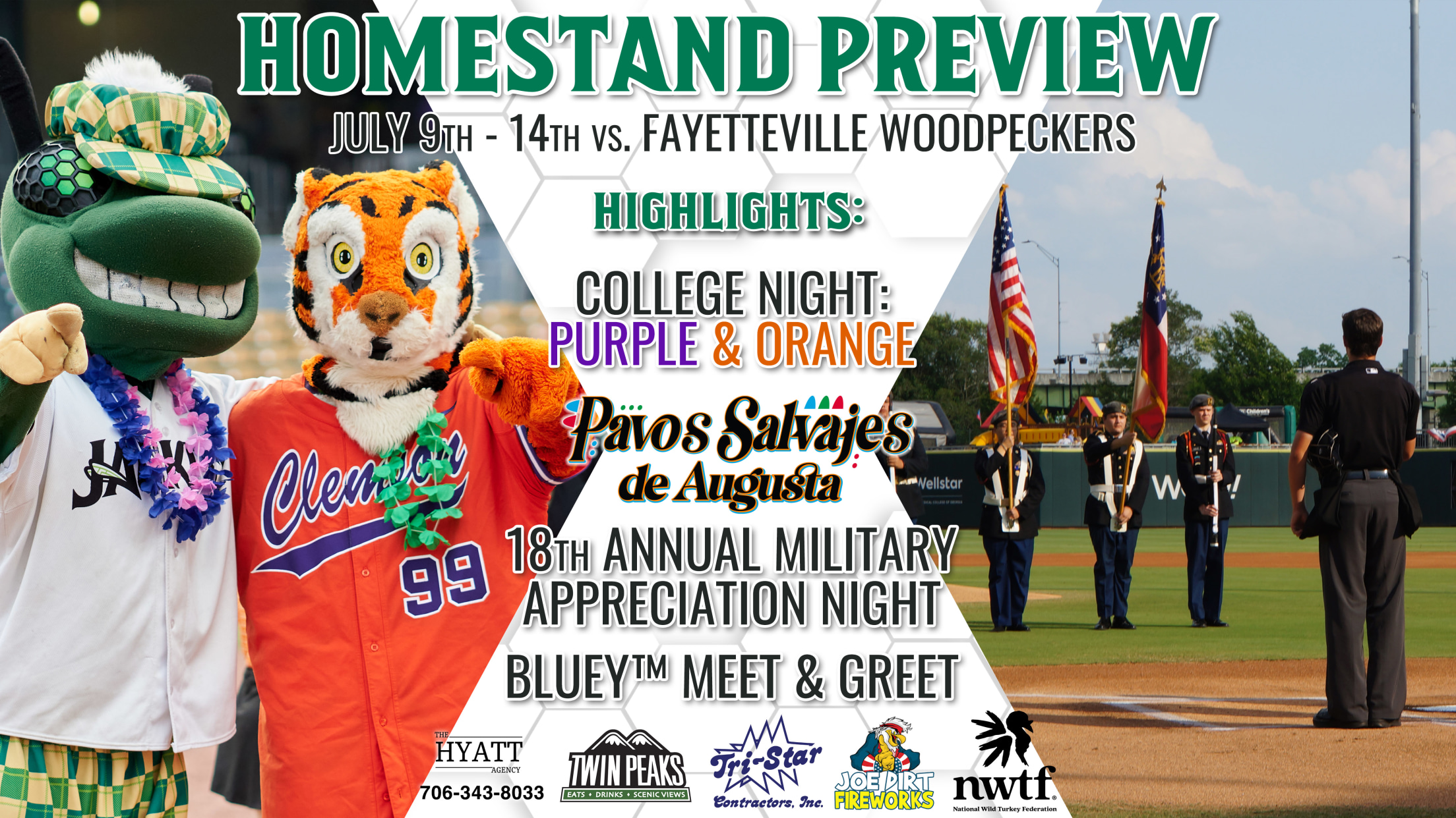 NORTH AUGUSTA, SC: The Augusta GreenJackets, the Single-A Affiliate of the Atlanta Braves, will play host to the Fayetteville Woodpeckers of the Houston Astros organization for the first time this year. The final homestand before the All-Star Break sees many exciting promotions come to SRP Park, including the final College Night of the summer, another Copa night featuring the Pavos Salvajes de Augusta, and Military Appreciation Night!
