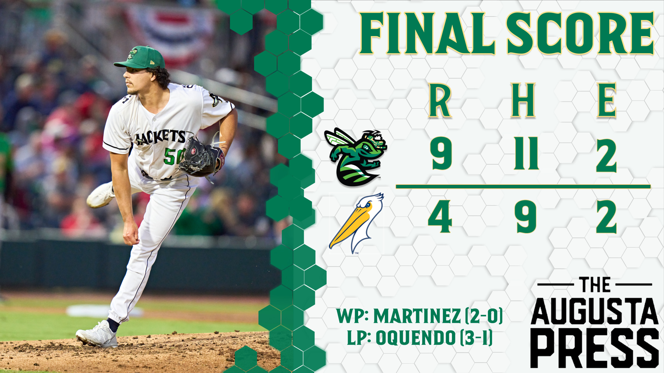 In the top of the ninth, the GreenJackets took 4 straight walks against Johzan Oquendo (L, 3-1), driving in the go-ahead run. Augusta added some insurance, with a Justin Janas RBI single, a wild pitch, and a Nick Clarno two-run ground-rule double putting the GreenJackets up 9-4. Martinez retired the side in order in the ninth to secure the victory.