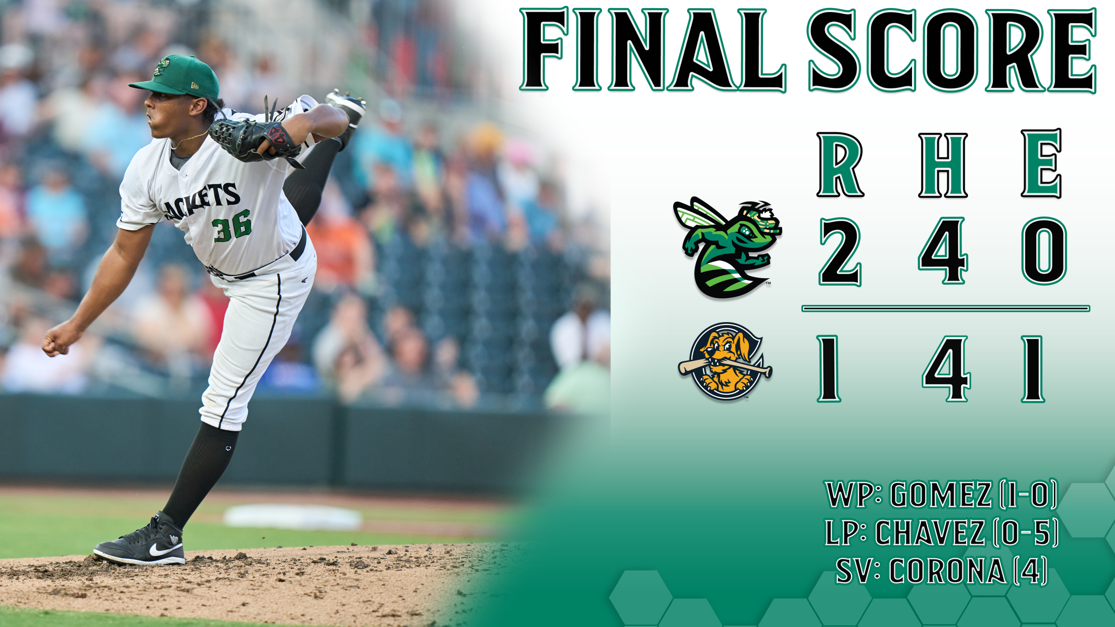 Neither side could solve the other in 7 innings, especially with Gill Hill taking the ball after the 3rd and proceeding to dominate to the tune of 6 scoreless innings on one hit. Both sides threatened in the 8th, with the GreenJackets stranding the go-ahead run in the top of the 8th and Jacob Gomez holding the Dogs scoreless in the 9th. Will Verdung proved to be the hero in the top of the 9th, cracking a two-out single up the middle to give the GreenJackets the lead. Reibyn Corona worked a 1-2-3 bottom half for his 4th save of the year, ending the losing streak and bringing the GreenJackets their first win in 26 days.