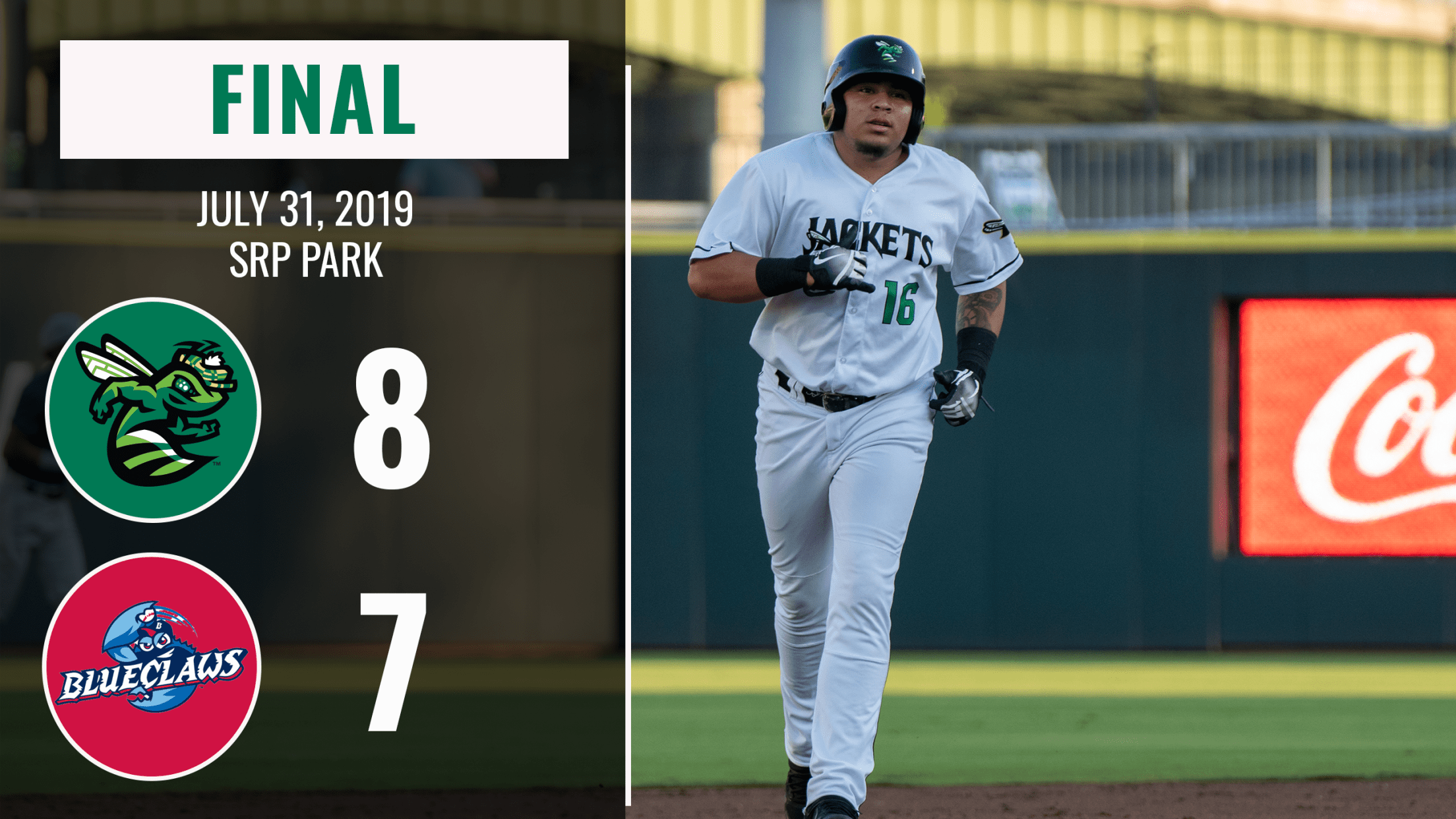 NORTH AUGUSTA, SOUTH CAROLINA: The Augusta GreenJackets (59-48, 23-16) fell down 7-3 in the 6th inning. Shane Matheny hit a two-run home run in the 6th. Then, it was Diego Rincones hitting his 2nd home run of the evening with a two-run bomb to tie it at seven in the 7th inning. In the 8th, Andres Angulo's RBI single put the Jackets in front for good, as they defeat the Lakewood BlueClaws (45-62, 16-21) by a final of 8-7 on Wednesday night.