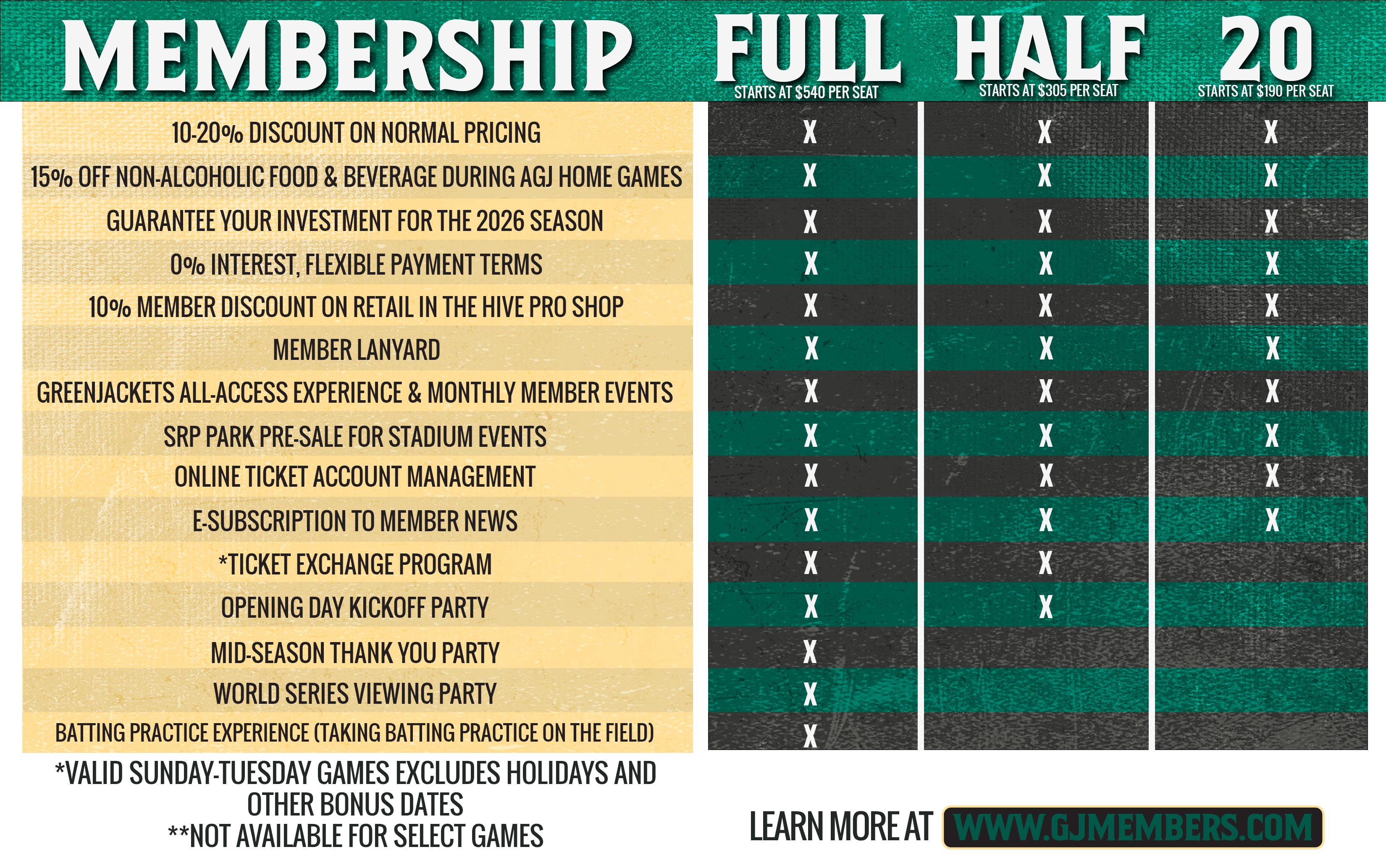 Become part of the GreenJackets family with a Full Season Membership and experience every pitch, hit, and home run all season long! Members enjoy the best seats, exclusive perks, and special access that make every game even more memorable. Don’t miss a moment of the action—buy your membership now using the button below, or learn more about all the benefits of being a GreenJackets Season Member!