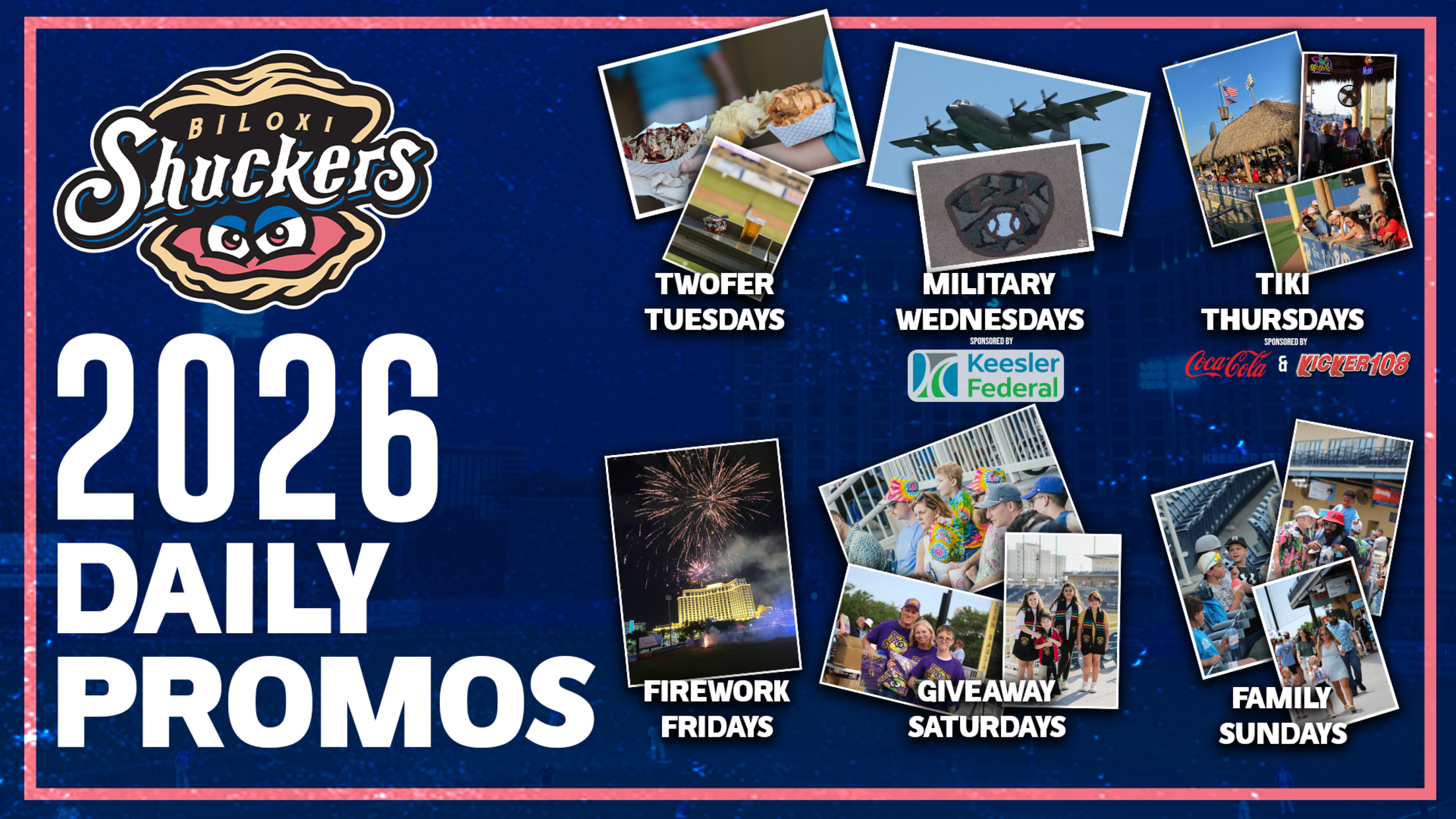 BILOXI, MS – The Biloxi Shuckers have announced daily promotions for the 2026 season as part of their promotional schedule. The team’s 69-game home schedule will begin on Tuesday, April 7, at 6:35 p.m. against the Pensacola Blue Wahoos. Premier home games include July 3 and 4 against the Chattanooga