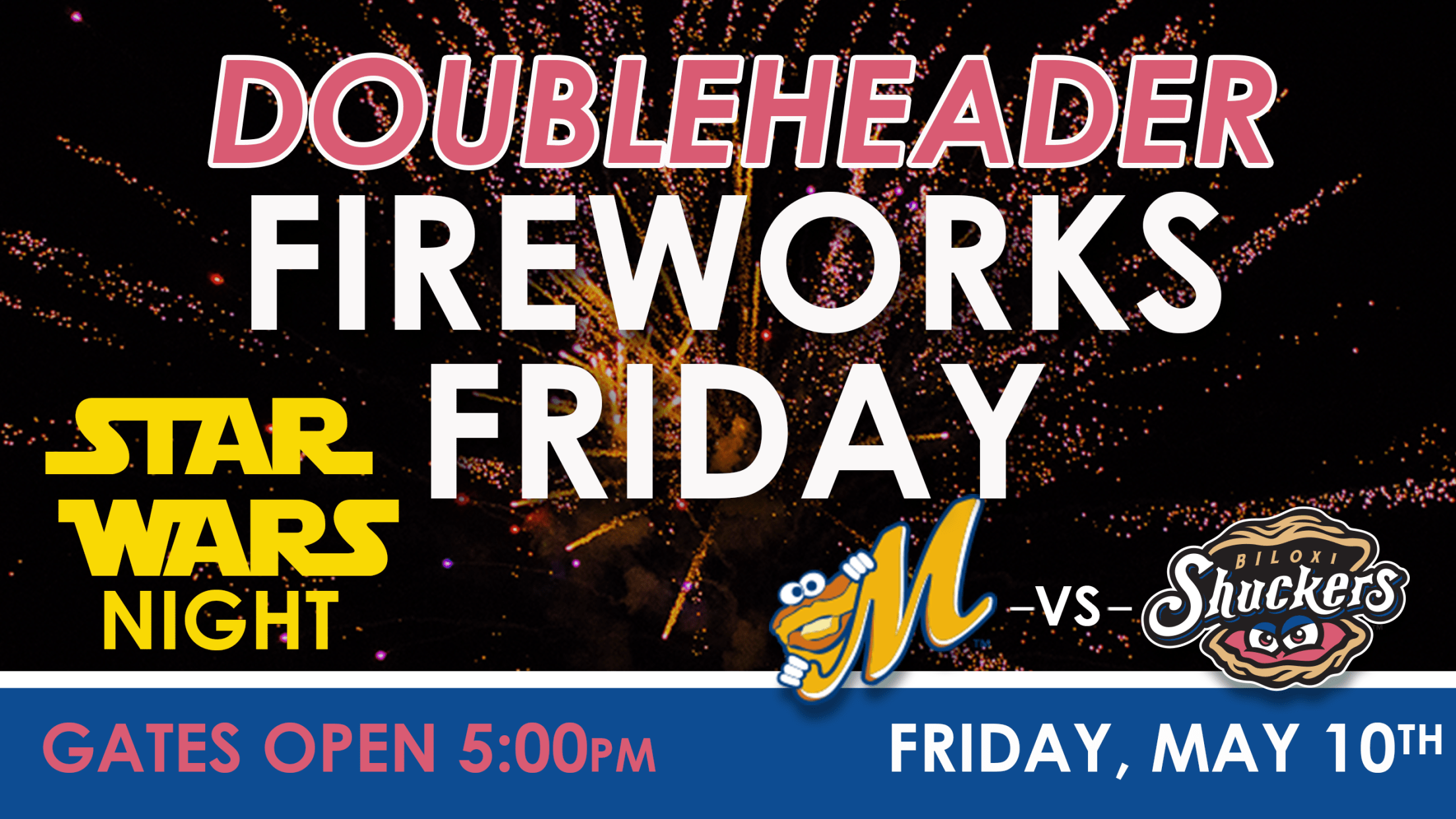 Gates will open at 5:00 pm for a 5:35 pm first pitch. The Shuckers and Biscuits will play two seven-inning games, with the second game starting approximately a half hour after the conclusion of the first game. On Fireworks Friday, there will be postgame fireworks following the second game. It's also Star Wars Night and Scouting with the Shuckers.