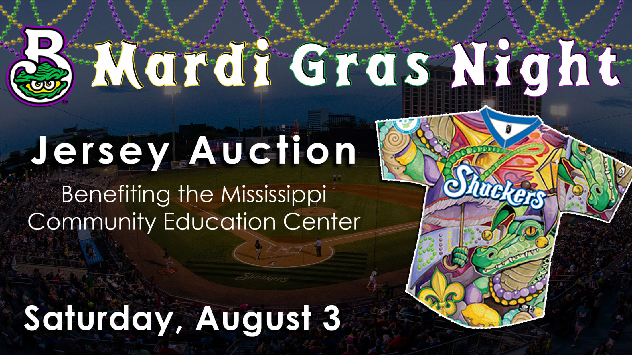 Purchase Tickets for Mardi Gras Night In preparation for their annual 'Mardi Gras Night,' the Biloxi Shuckers have unveiled their special Mardi Gras jerseys to be worn on August 3 against the Jacksonville Jumbo Shrimp at MGM Park. Fans will be able to bid on the game worn jerseys throughout the
