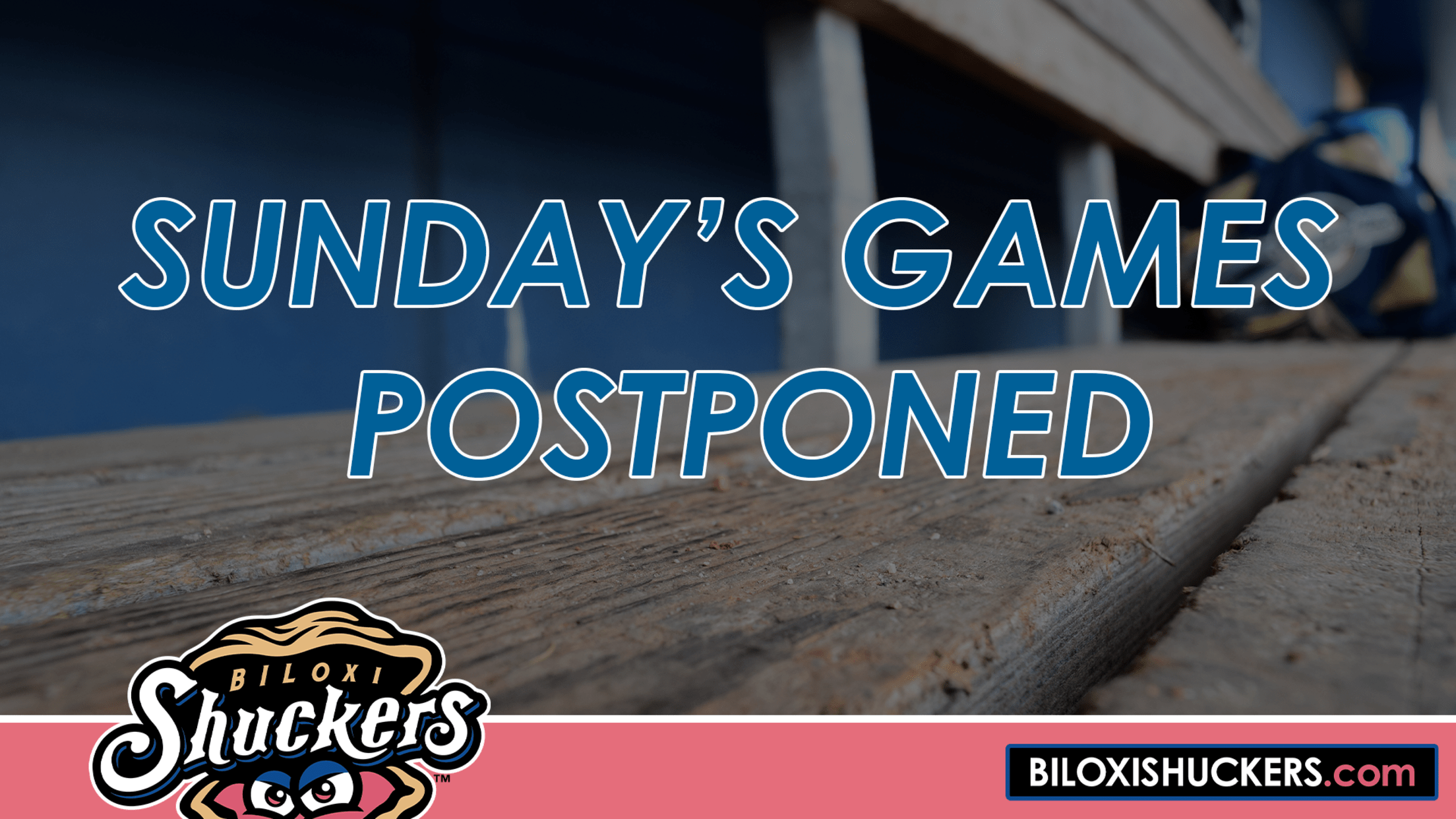 Sunday's games between the Biloxi Shuckers and Chattanooga Lookouts have been postponed due to impending weather. The Shuckers and Lookouts will resume their suspended game from Friday night on Monday at 5:35 pm and play it to completion as a nine-inning game. The Shuckers and Lookouts will then play a seven-inning game approximately 30 minutes after the conclusion of the suspended game.