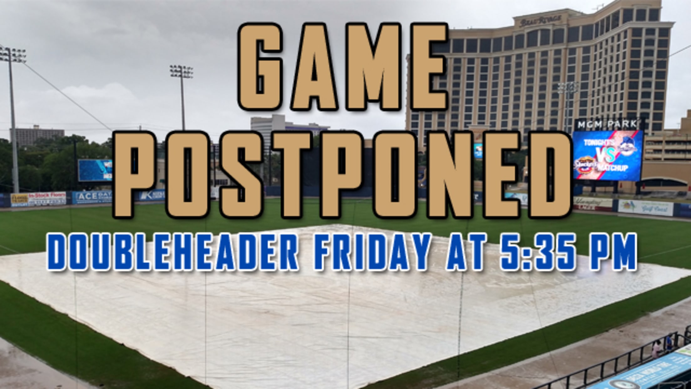 BILOXI, MS - Thursday's scheduled series opener between Biloxi Shuckers and Mississippi Braves at MGM Park has been postponed due to Tropical Storm Cindy. The game will be made up as part of a Friday doubleheader beginning at 5:35 pm. The MGM Park gates will open at 5:00 pm. The twin