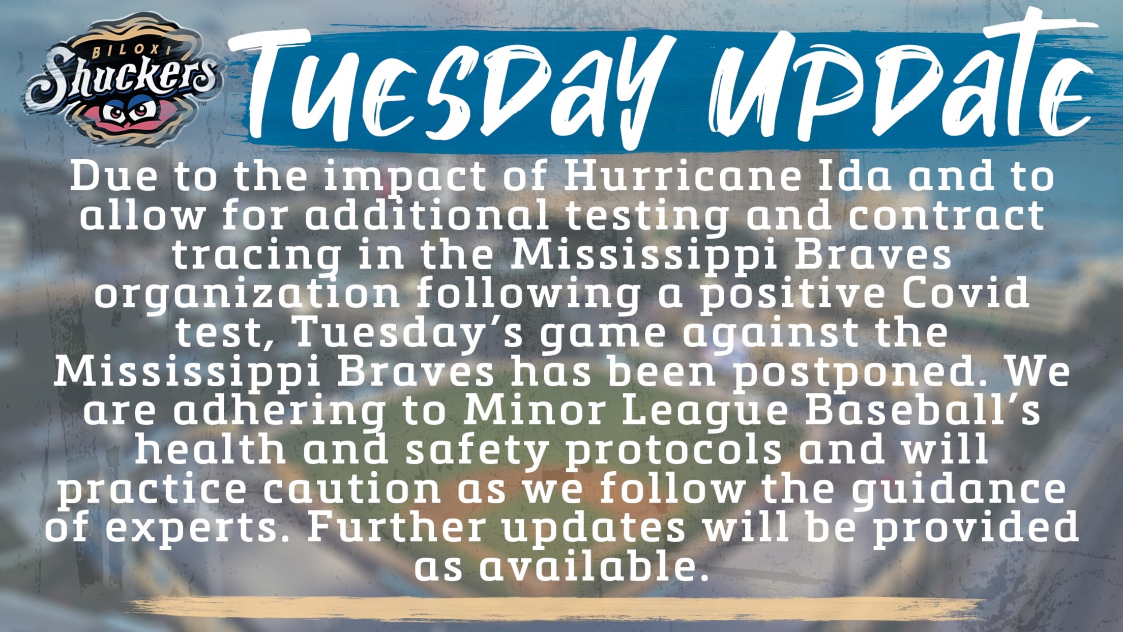 Due to the impact of Hurricane Ida and to allow for additional testing and contract tracing of the Mississippi Braves organization following a positive Covid test, Tuesday’s game against the Mississippi Braves has been postponed. We are adhering to Minor League Baseball’s health and safety protocols and will practice caution
