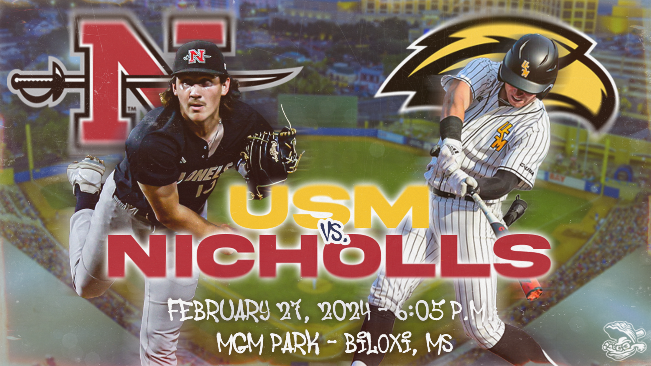 BILOXI, MS – After winning back-to-back Conference-USA Tournament titles at MGM Park in 2018 and 2019, the Southern Miss Golden Eagles are set to return to the Coast for a non-conference match-up against Nicholls on Tuesday, February 27 as part of the 2024 Hancock Whitney Classic. First pitch is scheduled