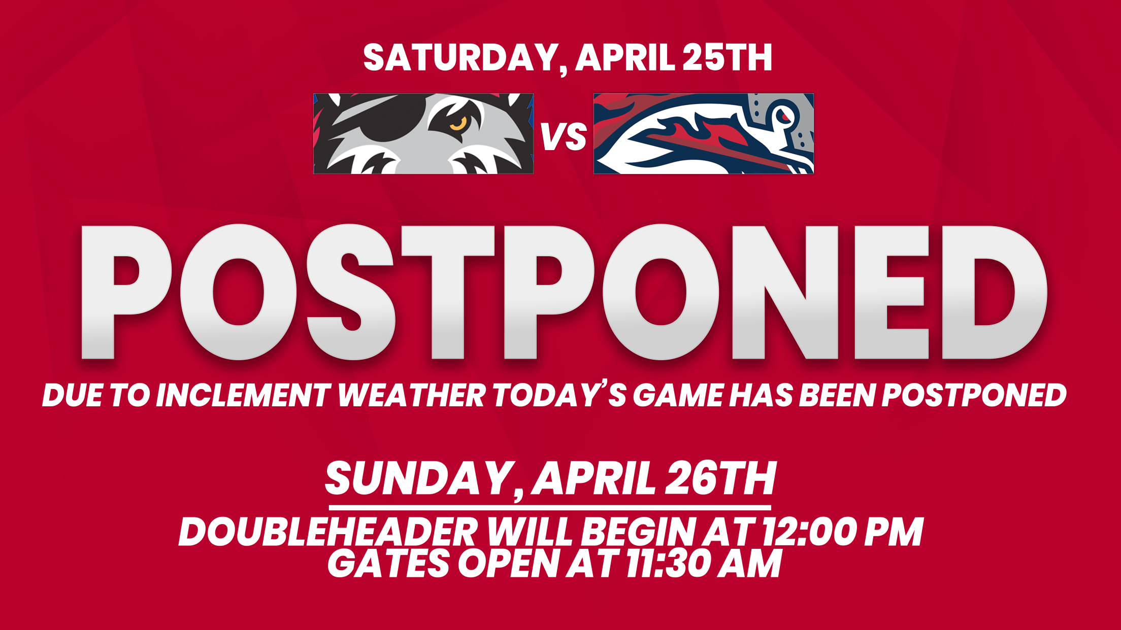 The game will be made up as part of a doubleheader (two seven-inning games) on Sunday, April 26, with the first game getting underway at 12 p.m. The second game will begin approximately 40 minutes after the conclusion of the first game. Gates will open at Mirabito Stadium at 11:30 a.m.