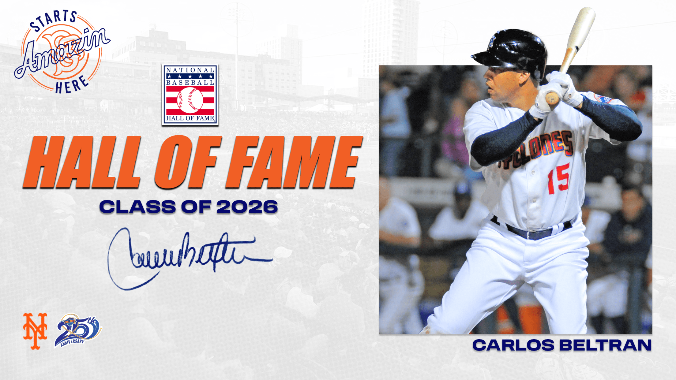 Brooklyn, NY -- January 20, 2026 -- Carlos Beltrán and Andruw Jones, who were born within one day of each other in 1977, moved even closer together Tuesday as the two center fielders were elected into the National Baseball Hall of Fame in voting by the Baseball Writers’ Association of America and tabulated by Ernst & Young. Beltran, who played in five games with the Brooklyn Cyclones in 2009, becomes the first former Cyclone to be elected to the National Baseball Hall of Fame.