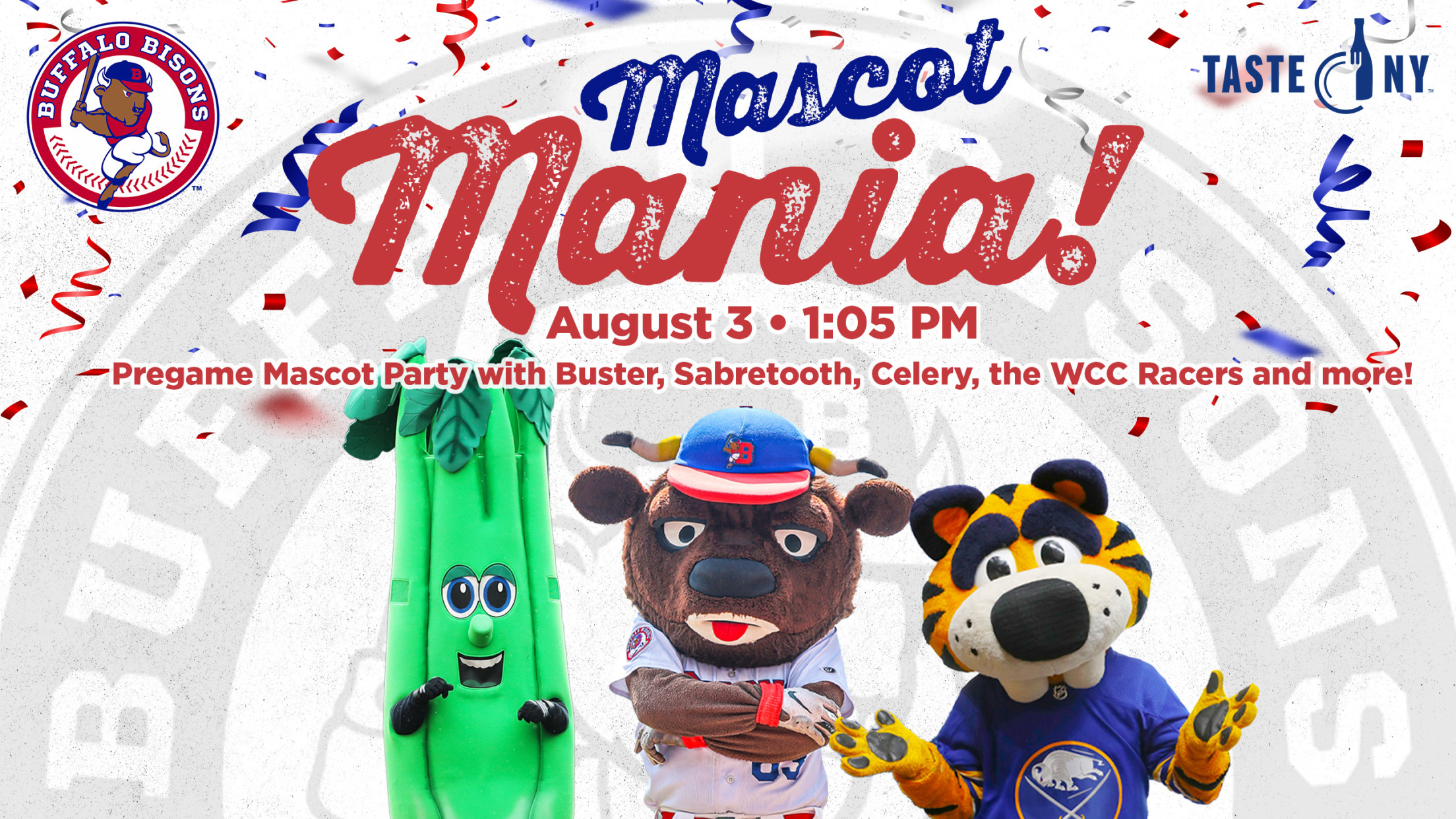 GET MY TICKETS Buster has invited all his Mascot friends to the Bisons game against the Syracuse Mets on Sunday, August 3rd (1:05 p.m.)... and it's going party! GET MY TICKETS It's going to be Mascot Mania, presented by TasteNY, as Buster is joined by Sabretooth, Celery, the WCC Racers,