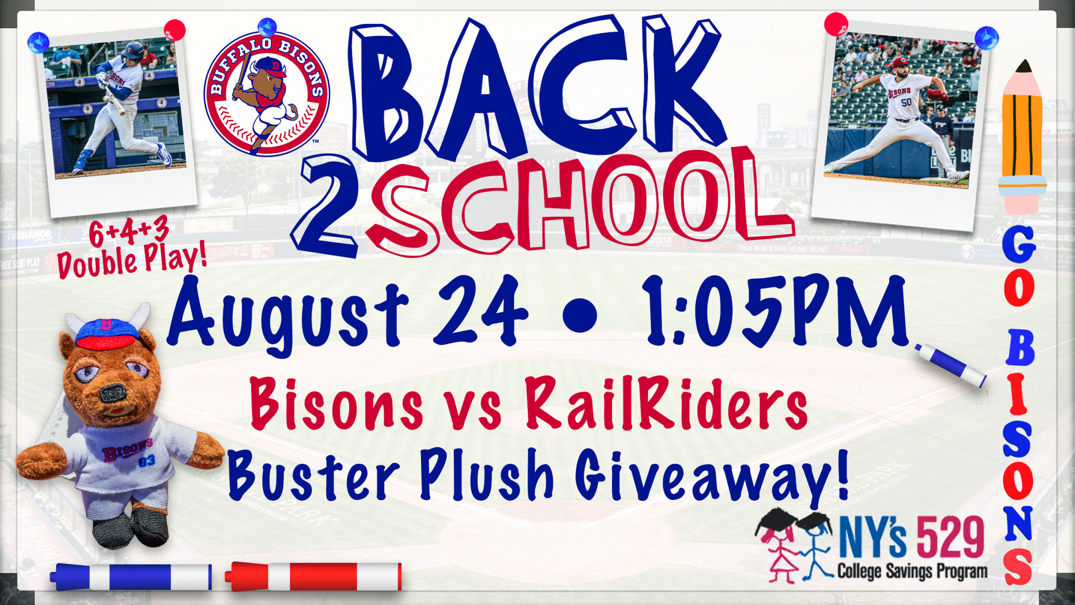 For the final Bisons weekend home game before the school year returns, we're giving kids plenty to shout about with an absolute jam-packed WNY Immediate Care 'Funday' at the park on Sunday, August 24. As the Bisons host Scranton/Wilkes-Barre for a 1:05 p.m. game, we'll have our annual Back 2 School Game with a Mini Buster Plush Giveaway, compliments of NY's 529 College Savings Program, as well as a special Carnival Day Games, presented by Coca-Cola... and that's on top of our customary Sunday Mascot Meet n' Greet and postgame Kids Run the Bases! GET MY TICKETS