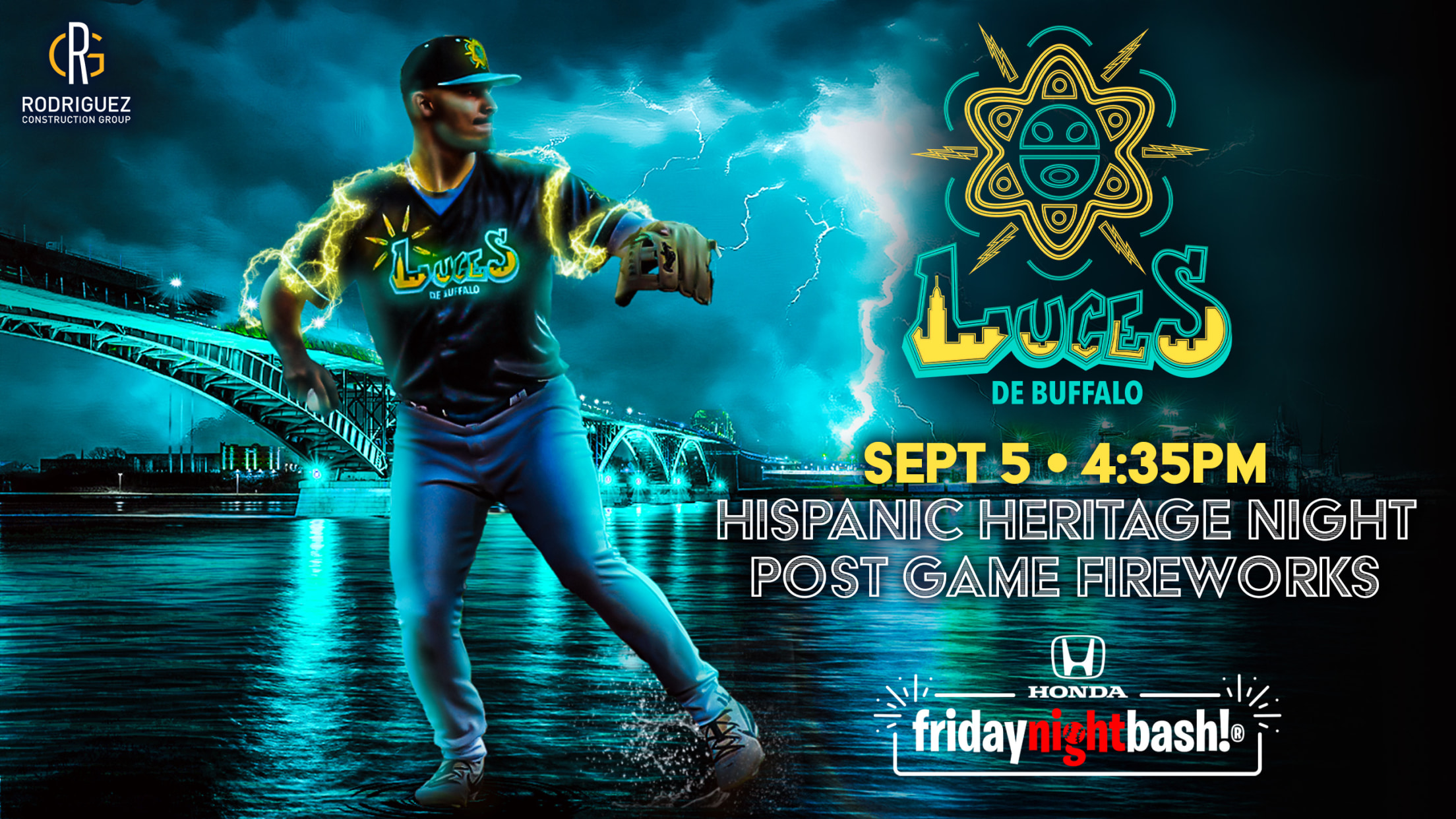 There are just two more Honda fridaynightbash! games left in the season, so you won't want to miss our next 'Bash, Friday, September 5 as the Bisons host the Syracuse Mets for a single-admission doubleheader (Game 1: 4:35 p.m., Gates 4 p.m., enter any time). It's the team's annual Hispanic Heritage Night, in partnership with the Hispanic Heritage Council of WNY. Live Music, great Food Specials, Fireworks and our 'Luces de Buffalo' Team Jerseys are all part of this fun-filled night at Sahlen Field! GET MY TICKETS!