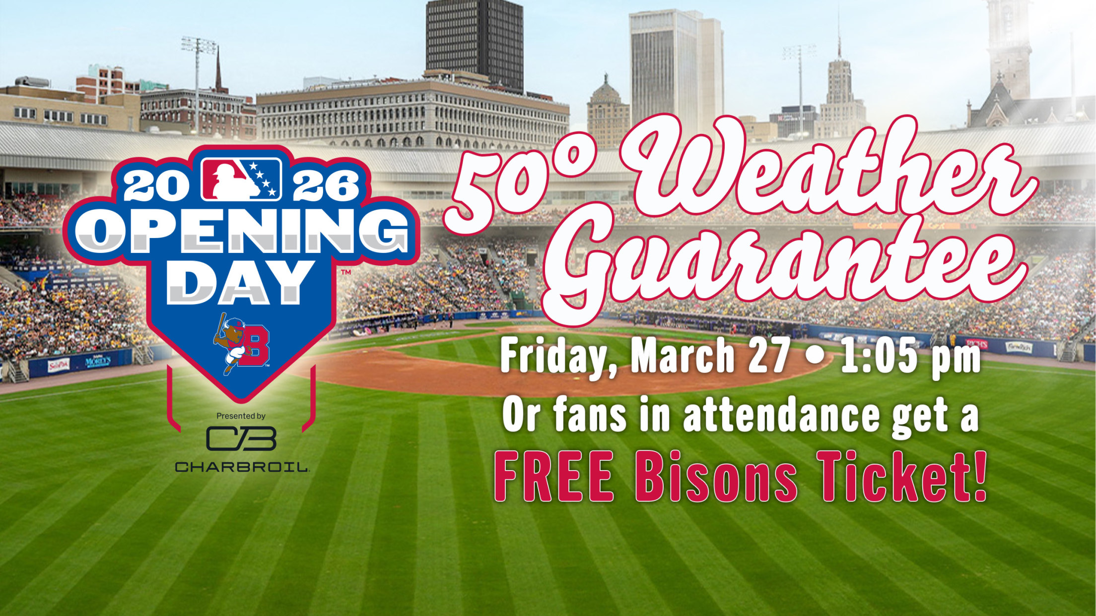 On Opening Day, it WILL BE 50 DEGREES at first pitch! But if it’s not, all fans in attendance will be able to exchange their game ticket at the Sahlen Field Box Office for a FREE TICKET for any Bisons home game through May 31 (exchange can be made any time).