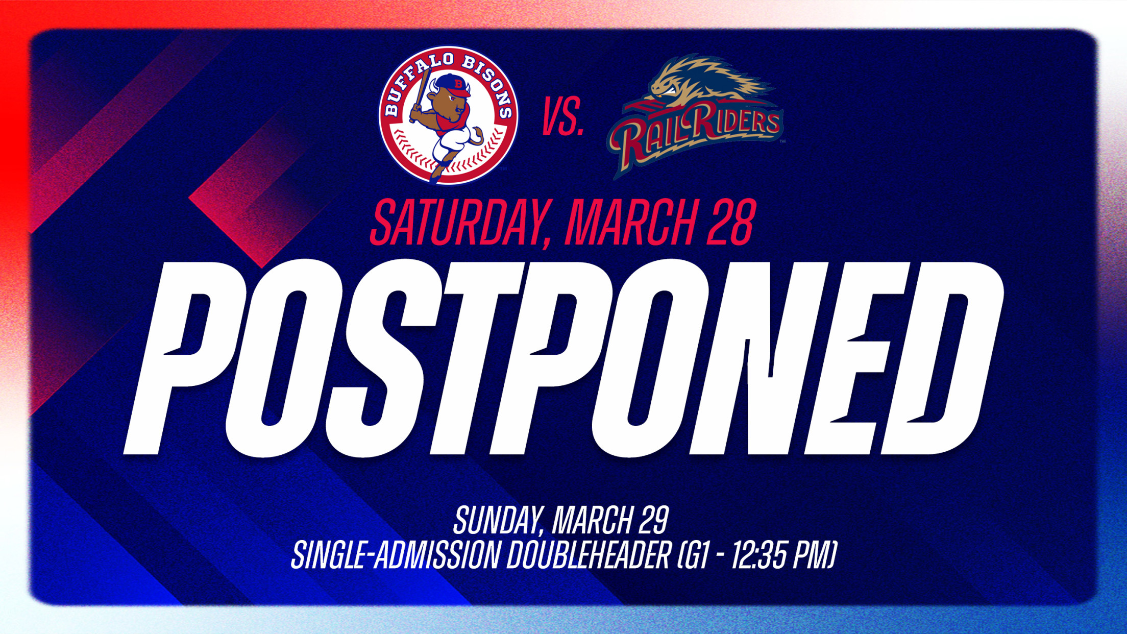 Saturday's Bisons/RailRiders game postponed. Single-Admission Doubleheader set for Sunday, March 29 (12:35 p.m.)