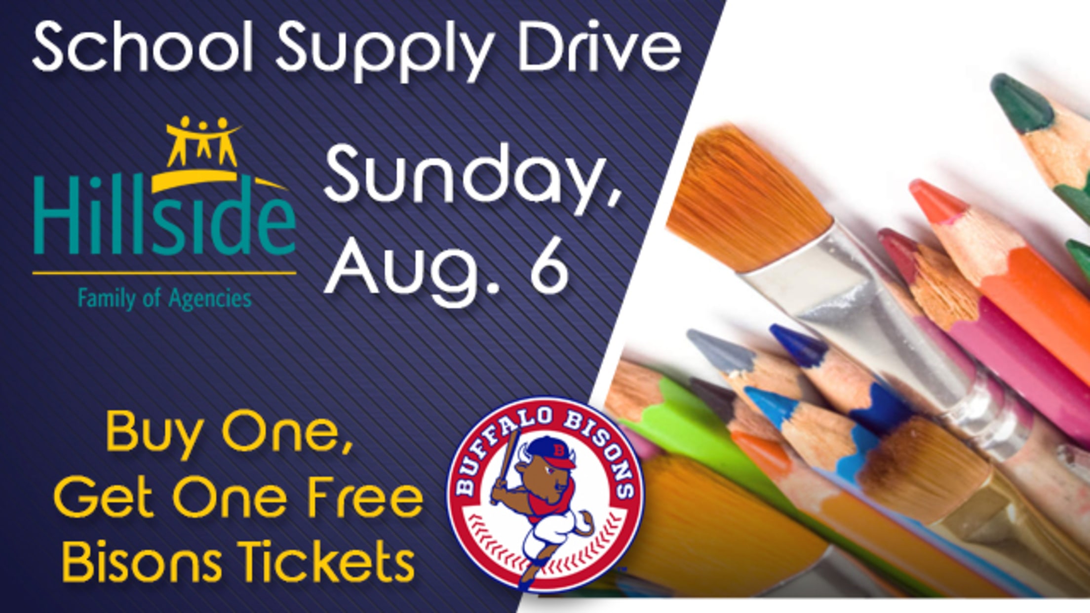 The Buffalo Bisons and Hillside Family of Agencies will be teaming up to help kids in need bring in the new school year the right way with a School Supply Drive at Coca-Cola Field on Sunday, August 6.Any fan who brings in new or unused school supplies will receive a