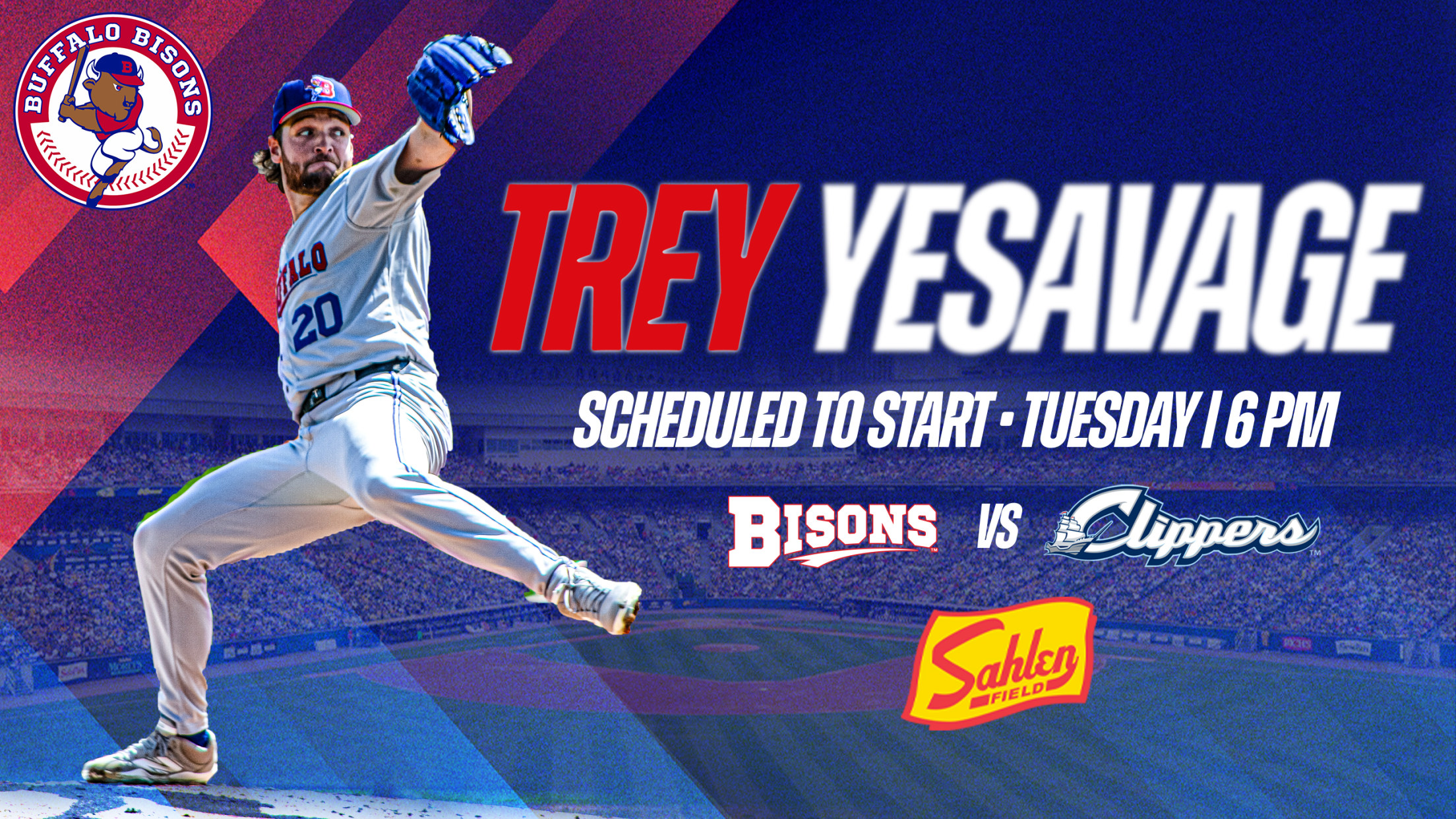 GET MY TICKETS Toronto Blue Jays starter and top prospect, Trey Yesavage, is scheduled to make his fourth Major League injury rehab appearance on Tuesday night at Sahlen Field for the Buffalo Bisons when they host the Columbus Clippers at 6:05 p.m. at Sahlen Field. GET MY TICKETS Tuesday's opener