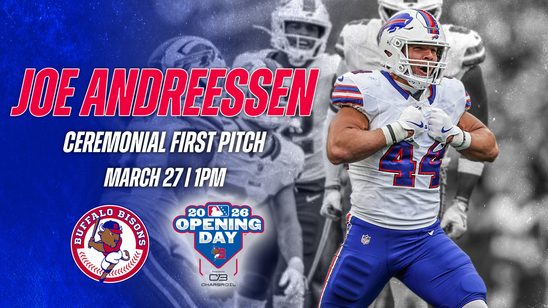 GET MY TICKETS The Buffalo Bisons are thrilled to announce that Buffalo Bills linebacker JOE ANDREESSEN will kick off the Herd’s 2026 season by delivering the Ceremonial First Pitch on Opening Day at Sahlen Field, Friday, March 27 (1:05 p.m.) before the Herd hosts Scranton/Wilkes-Barre. GET MY TICKETS The Bisons