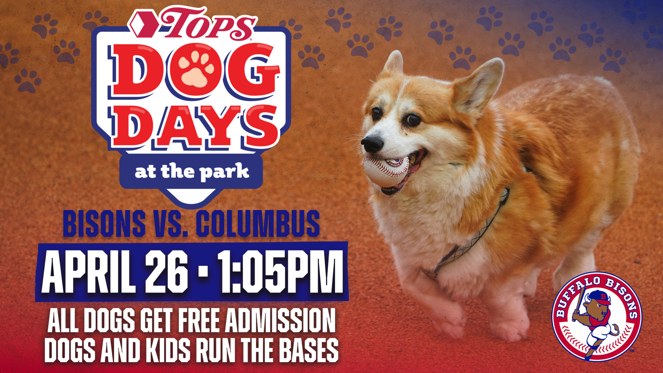 Our first Tops Dog Day of the Season is Sunday, April 26 as the Bisons host the Clippers (1:05 p.m.) and we're adding a new twist to our very PUPular event.. We're holding a postgame Dogs AND Kids Run the Bases!