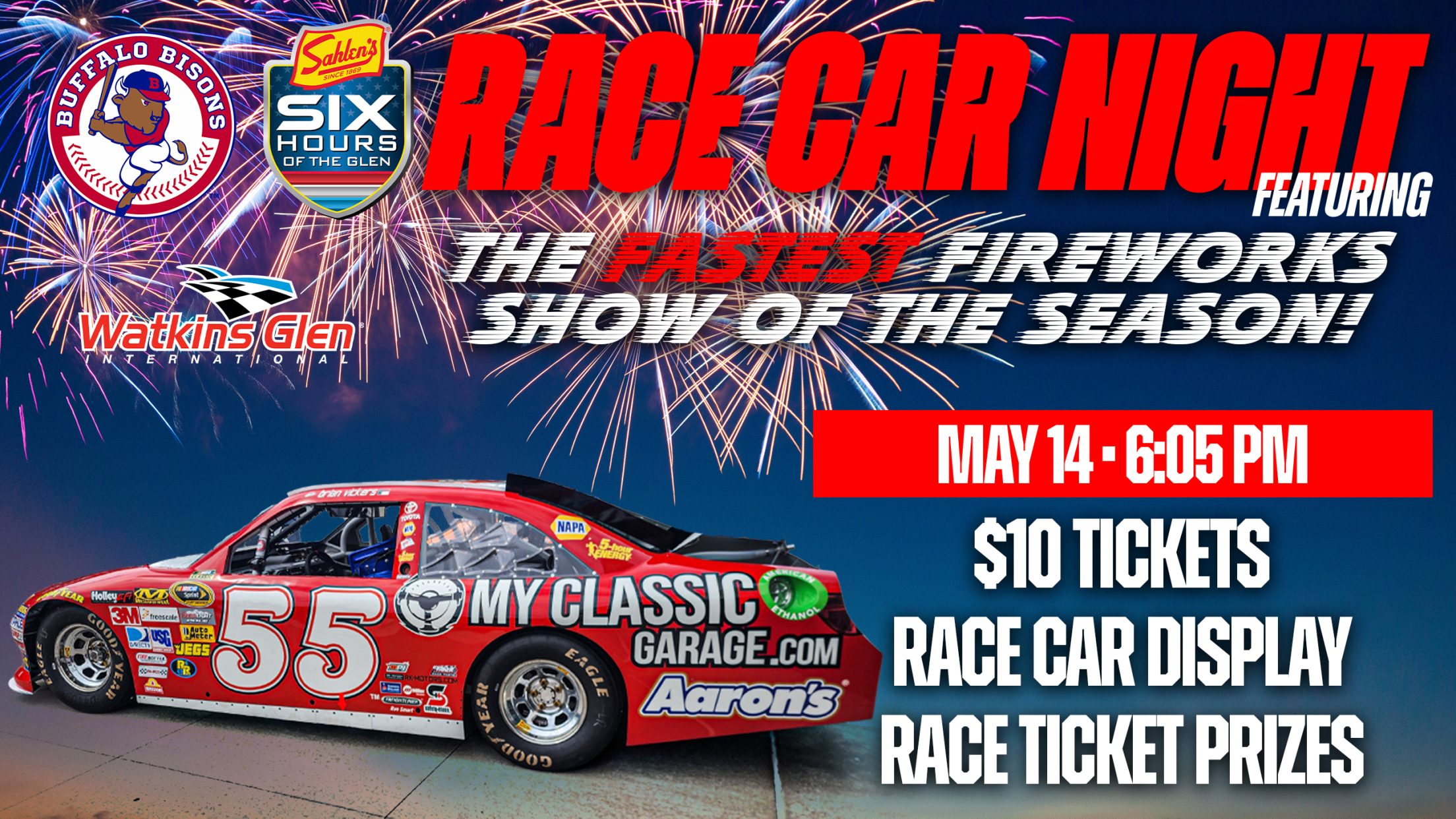 “WE WANNA GO FAST!” The Bisons have once again teamed up with Sahlen’s and Watkins Glen International for the 2nd Annual ‘Race Night at the Ballpark,’ Thursday, May 14 against the Worcester Red Sox (6:05 p.m.), with a night that will feature a Sahlen Field first… The FASTEST Fireworks Show of the Season!