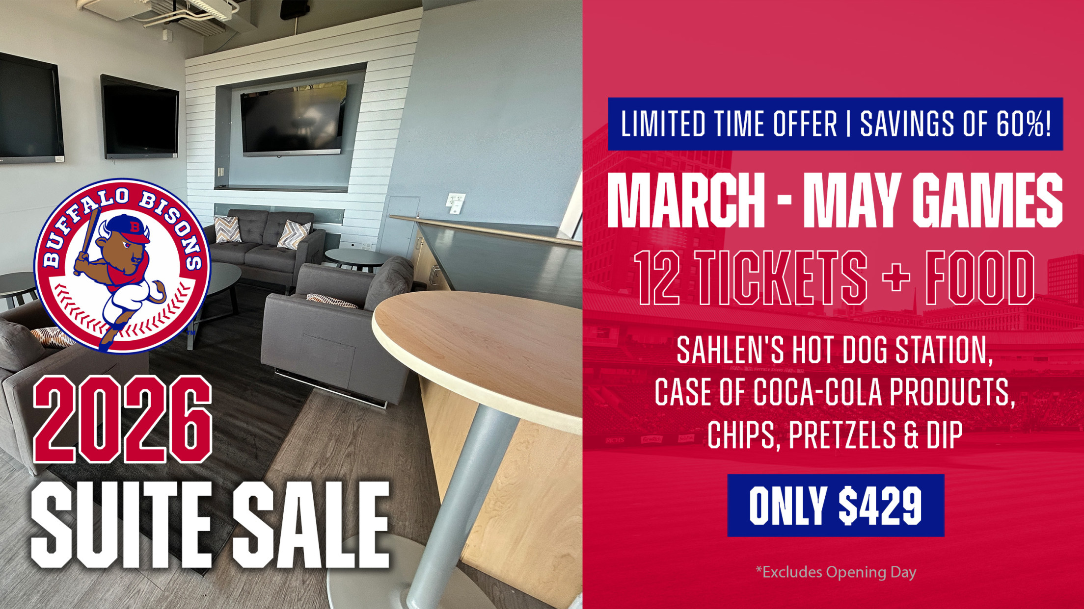 BOOK BISONS SUITE One of the best deals at the ballpark is back! Now is your chance to reserve Bisons 2026 Game Day Suite for you and your friends and family for only $429! Our Fall Suite Pre-Sale is valid for all Bisons home games from March 28 through May