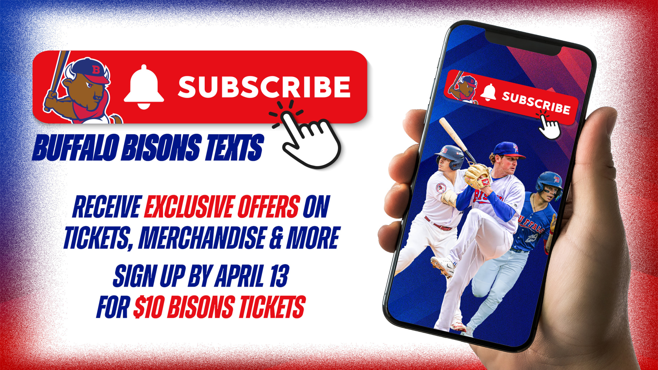 EXCLUSIVE OFFER: To kick off this great new option for Bisons fans, the team will be providing all fans that sign up an exclusive 72-hour window to purchase any Bisons single-game ticket for just $10 each. To be eligible, fans must opt-in by Monday, April 13. (*promo code to be sent April 14).