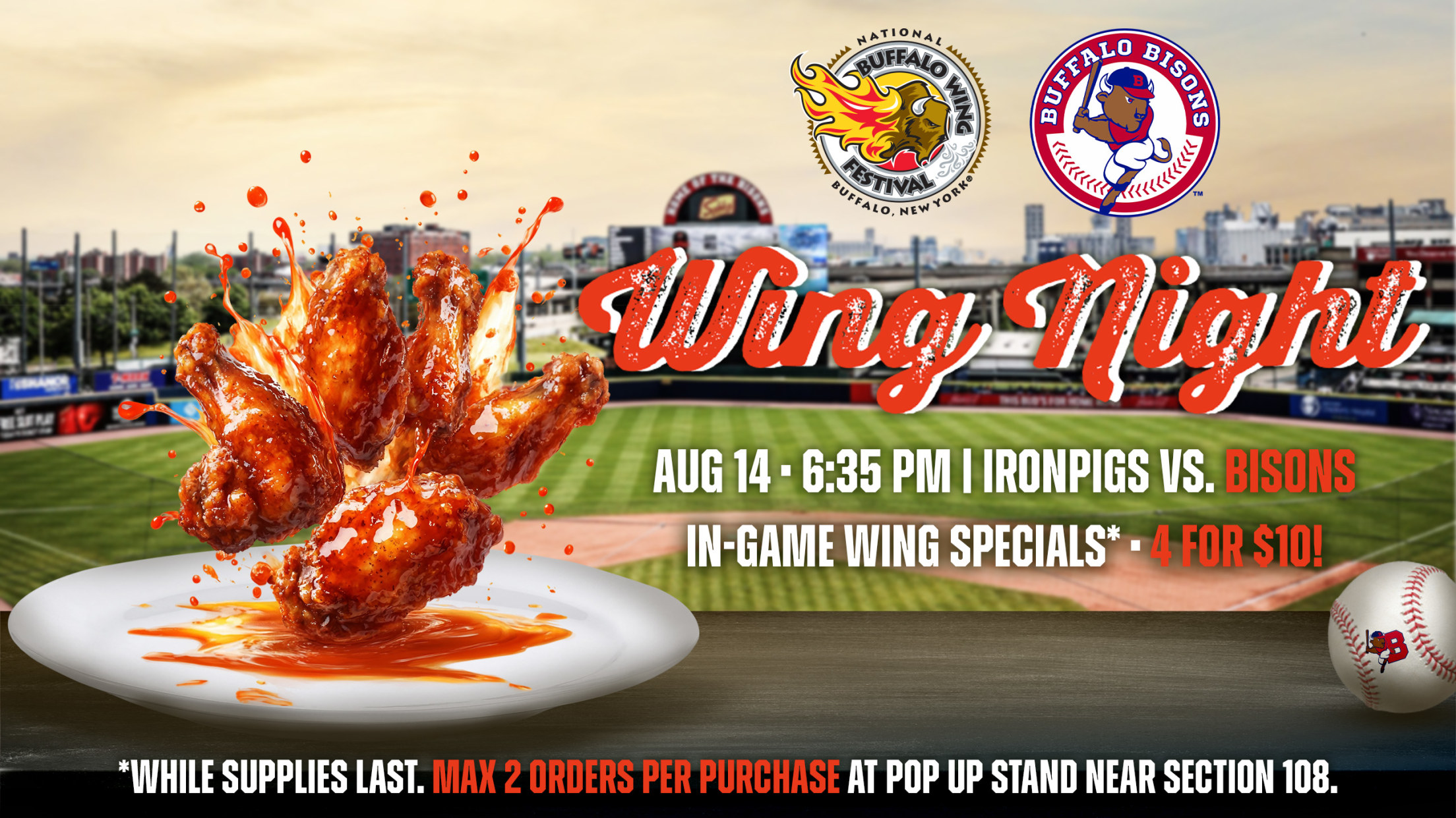 GET MY TICKETS In the spirit of National Buffalo Wing Festival returning to Sahlen Field and the countdown to the annual celebration August 30-31, we're holding our out Wing Night at the ballpark on Thursday, August 14 as the Bisons host the IronPigs at 6:35 p.m. GET MY TICKETS Celebrate