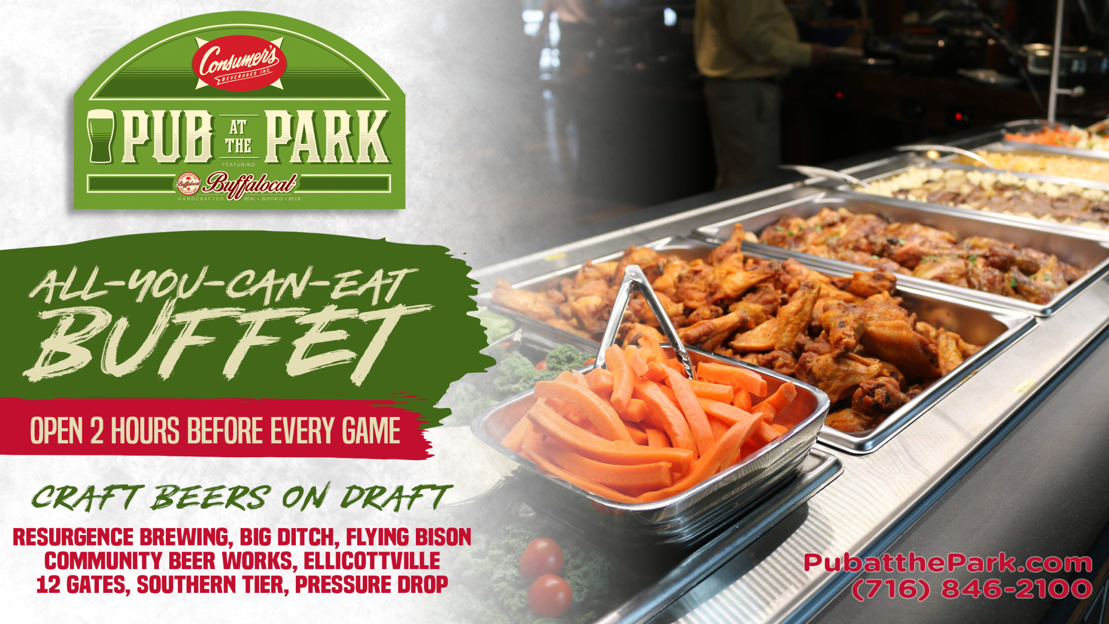 The restaurant and bar will be open two hours before the scheduled first pitch of all Bisons games and feature an All-You-Can-Eat Buffet for only $17.95 (children 12 years old and younger are $12.95).