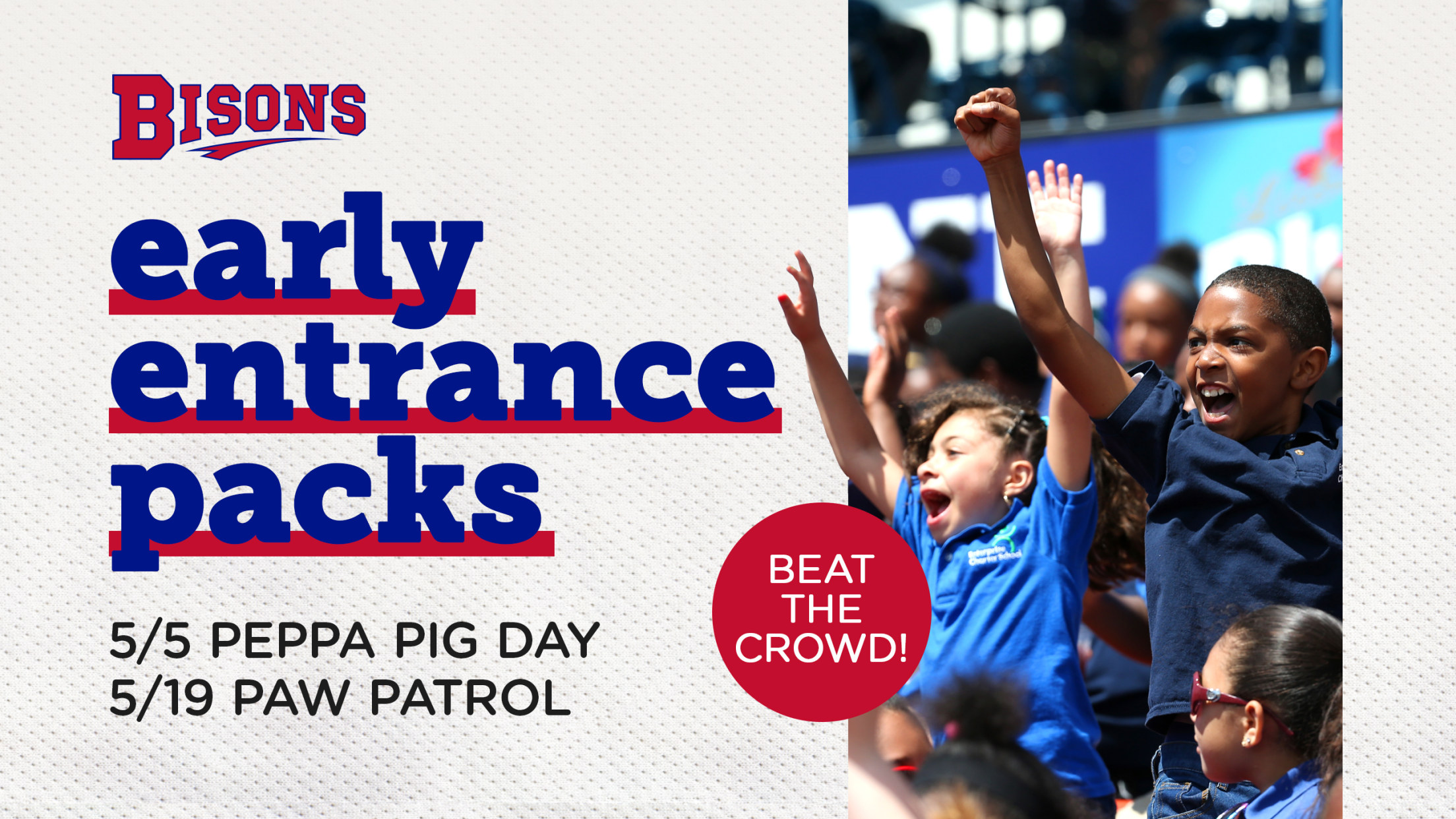 All the way from across the pond, Peppa Pig and her brother George will be at the Kids Club Sunday on May 5 as the Bisons host the Lehigh Valley IronPigs (1:05 p.m.). Then, straight from Adventure Bay, PAW Patrol's Chase and Skye will be on the case and ready to fly for the team's Kids Club Sunday on May 19. Each day will also include postgame Kids Run the Bases, presented by Platter's Chocolate Factory.
