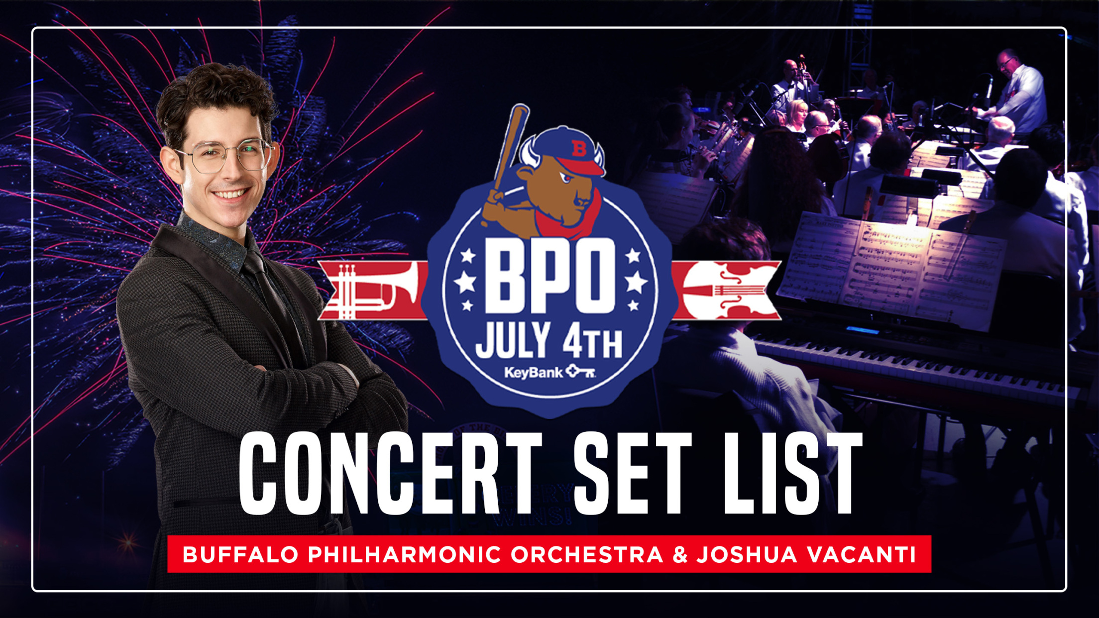 The great WNY summer tradition of the KeyBank Independence Night Celebration returns for the first time in three years on Monday, July 4th following the Bisons 6:05 p.m. game against the Syracuse Mets. With the much-anticipated event just days away, the Bisons revealed the postgame Concert Set List for the maestro Paul Ferington and the Buffalo Philharmonic Orchestra and special guest, The Voice star, Joshua Vacanti