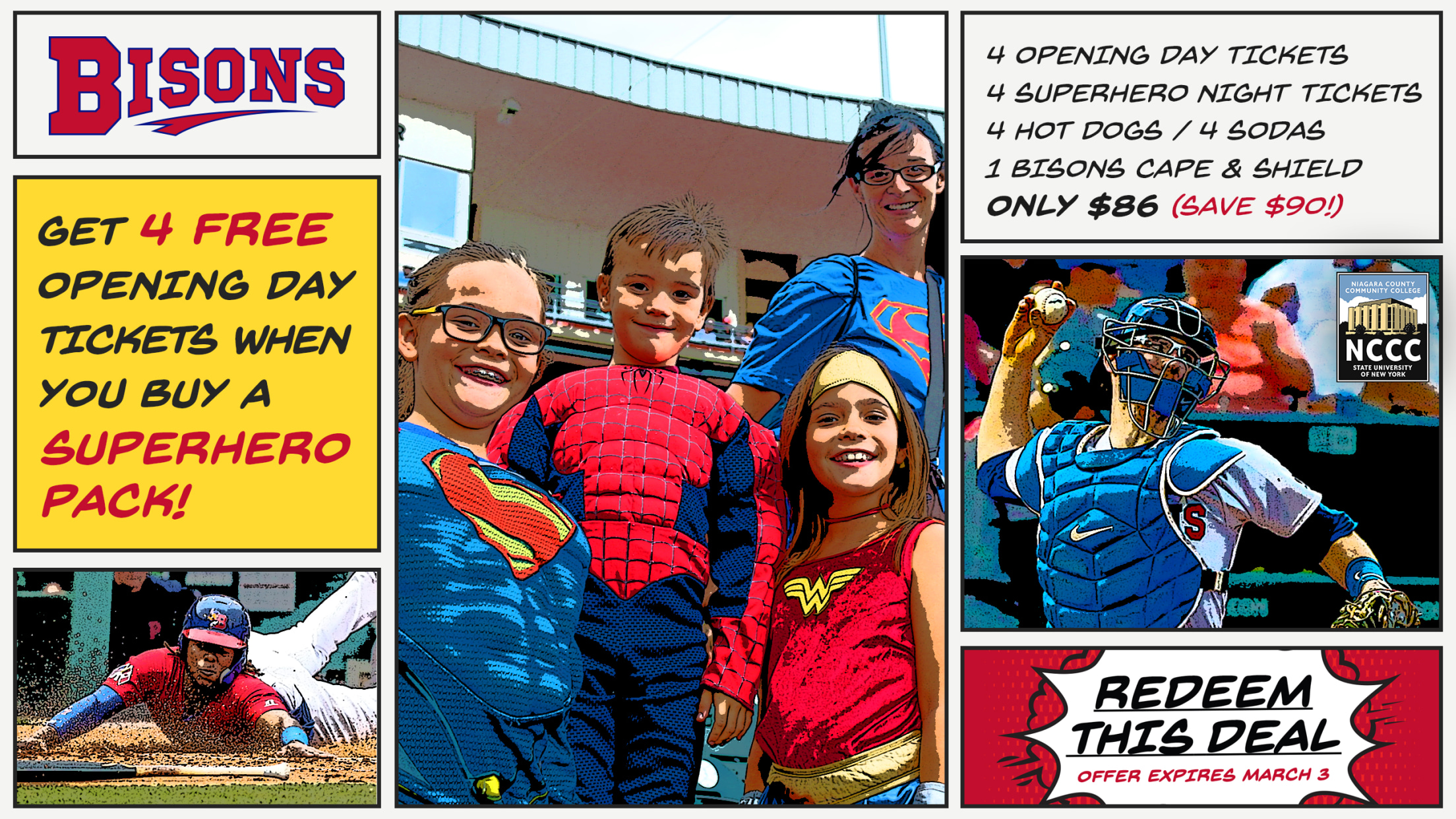 That's the power you possess this week at Bisons.com. Just purchase our Superhero Pack for this year's Superhero Night by Sunday, March 3, and we'll include four FREE tickets to this year's Opening Day at Sahlen Field.