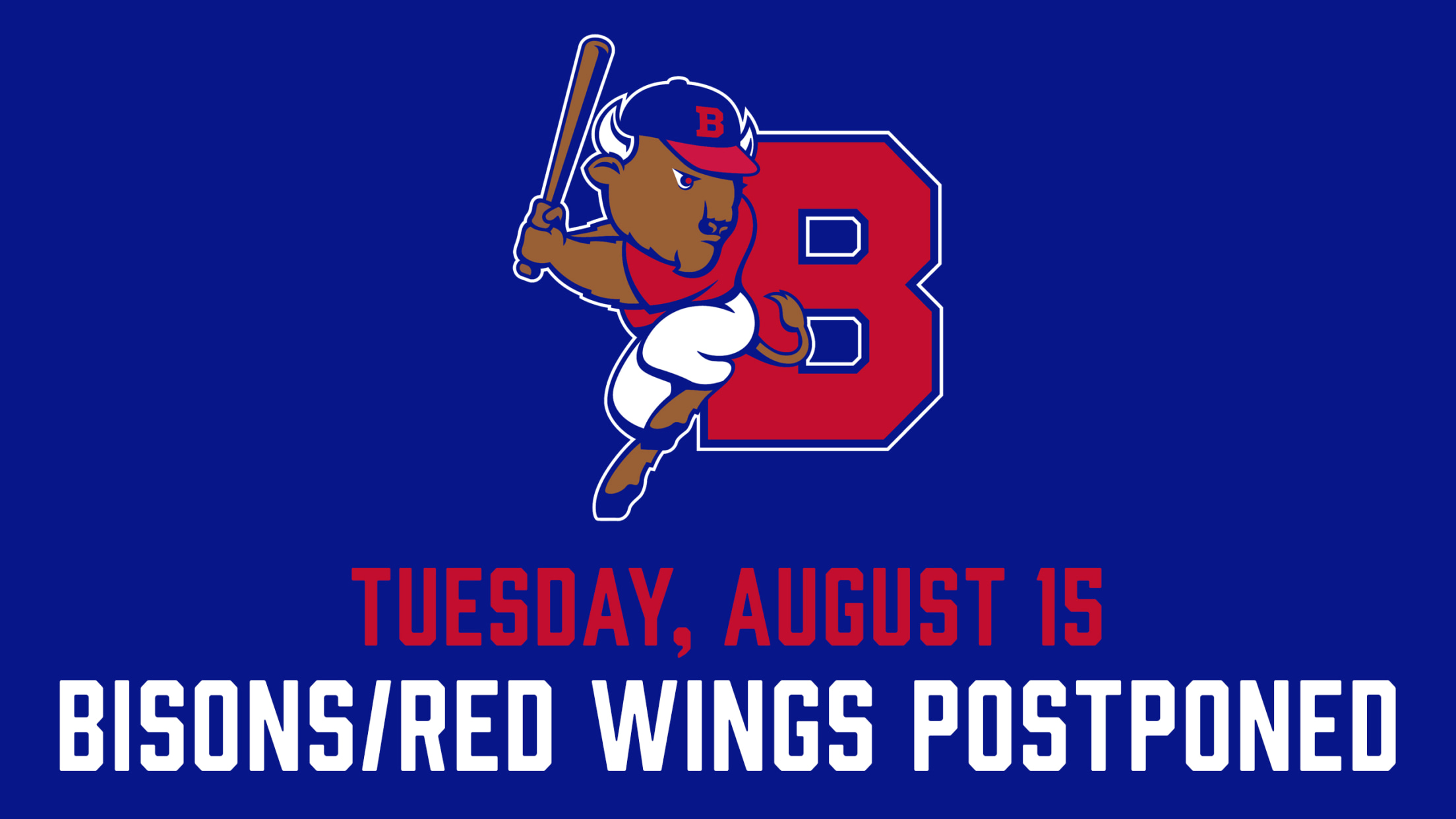 The Buffalo Bisons have announced that their scheduled game on Tuesday, August 15 against the Rochester Red Wings at Sahlen Field has been postponed due to rain. A make up date for the postponed game is to be announced.