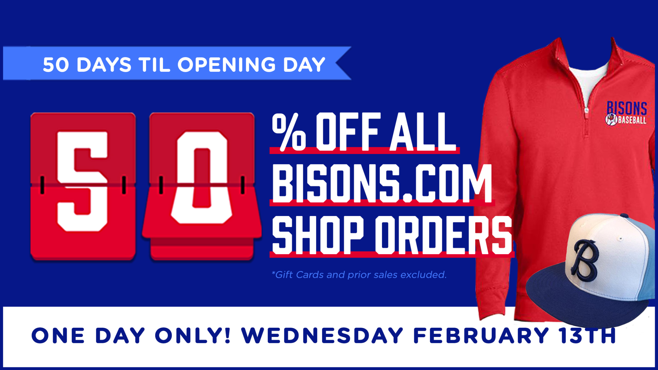 It's back!!!The Bisons fan-favorite "50-Days, 50% OFF Sale" has returned to the Bisons.com online shop for ONE DAY ONLY - Wednesday, February 13.>>>Bisons.com Online ShopOne day with no promo codes and no minimums… just MASSIVE savings to get you ready for the baseball season.Jerseys, t-shirts, on-field caps...we got them all!!!