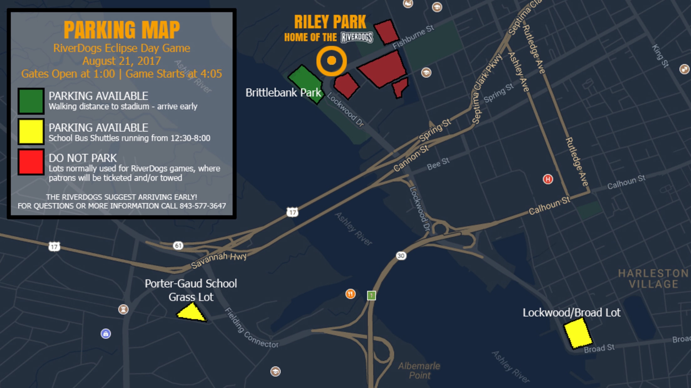 RiverDogs fans should note different parking options available during the Eclipse Game on Monday, August 14 using the graphic above.