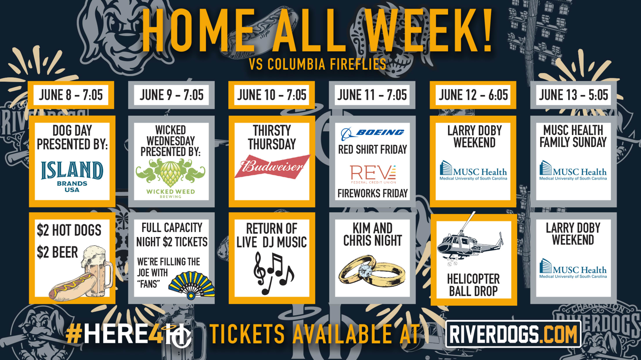 The Charleston RiverDogs return home for the first time this month to host the Columbia Fireflies from June 8-13 with no restrictions on capacity. The team has stuffed the six-game set with more promotions and theme nights than any other homestand so far this season.